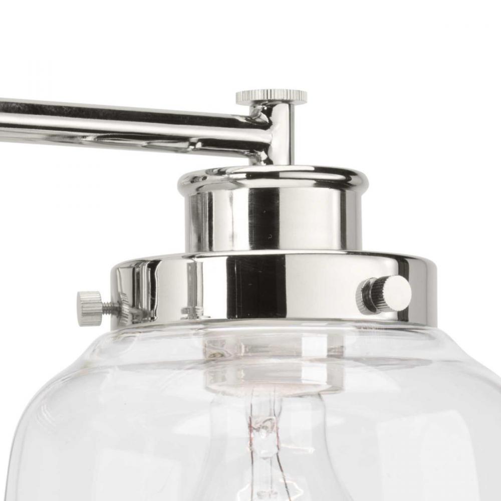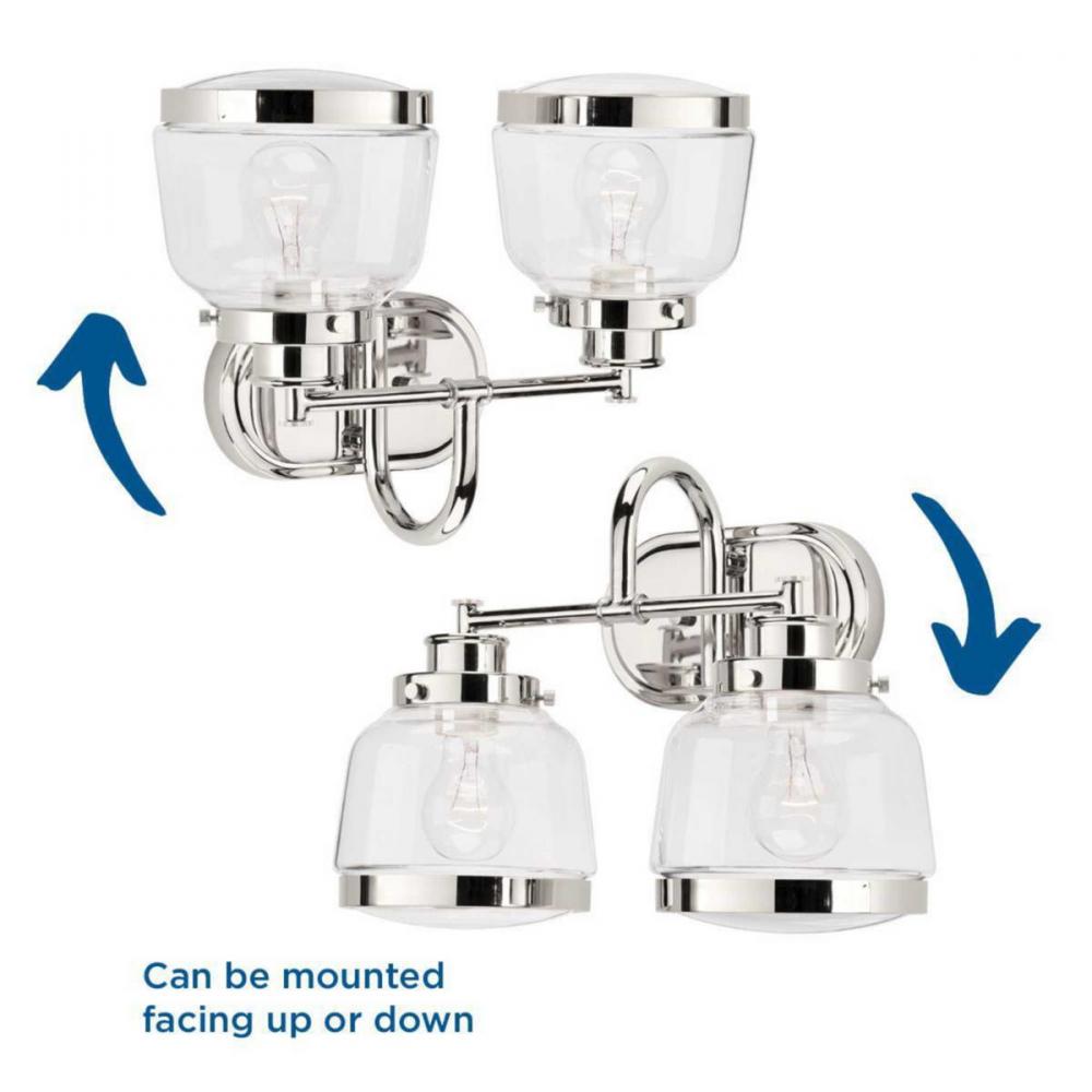 Ideal for a bathroom and powder room.;Perfect for farmhouse and vintage electric style settings;Subtle polished nickel finish;Crisp clear glass shades;Mount the light fixture facing up or down;Use 2 medium base bulbs that are sold separately (75 W max - LE