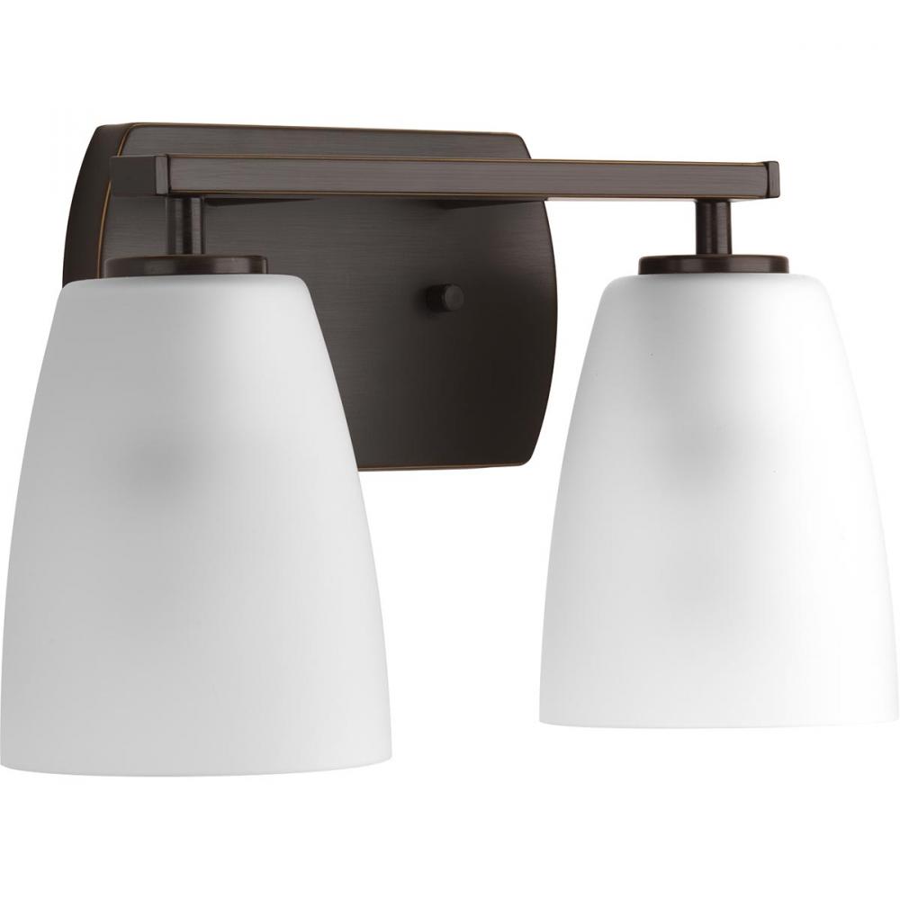 Ideal for a bathroom and powder room.;Perfect for modern and transitional style settings;Handsome antique bronze finish;Elegant etched glass shades;Mount the light fixture facing up or down;Use 2 medium base bulbs that are sold separately (100 W max - LED/