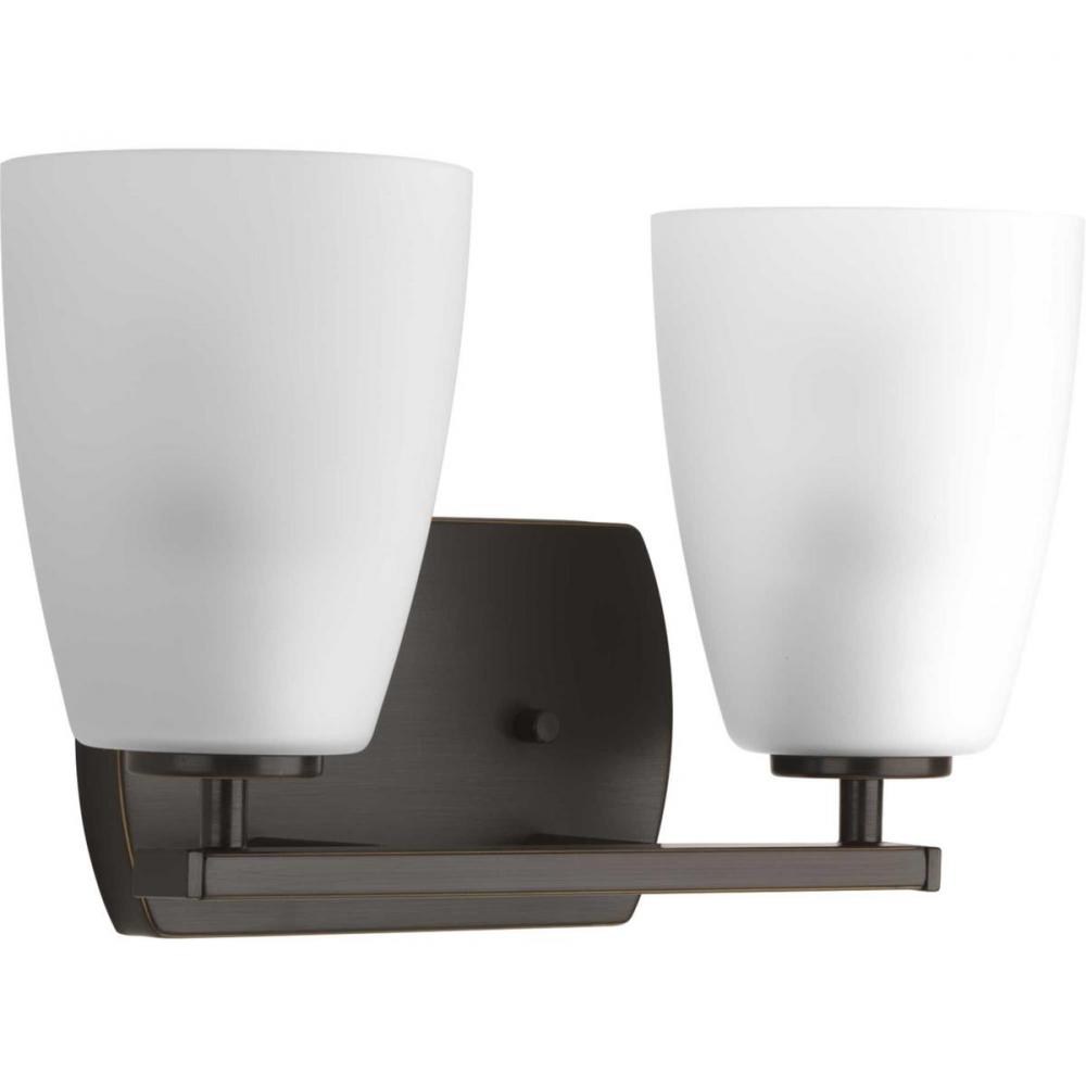 Leap vanity fixtures feature tapered etched glass shades to complement contemporary design trends. Two-light bath & vanity in an Antique Bronze finish.