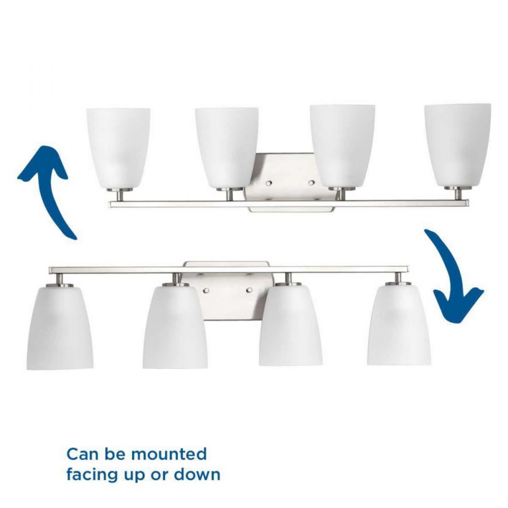 Ideal for a bathroom;Perfect for modern and transitional style settings;Beautiful brushed nickel finish;Elegant etched glass shades;Mount the light fixture facing up or down;Use 4 medium base bulbs that are sold separately (100 W max - LED/CFL/incandescent