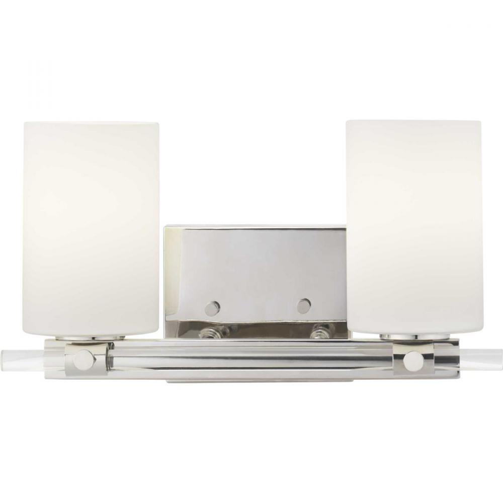 Enjoy high status with a two-light bath and vanity in the Lisbon Collection that is full of femininity, gleam and shine. Etched opal glass shades sit atop an elegant K9 glass rod, highlighted with a Polished Nickel finish. The highly polished design style complements both Modern and Luxe interiors – and can be mounted up or down.