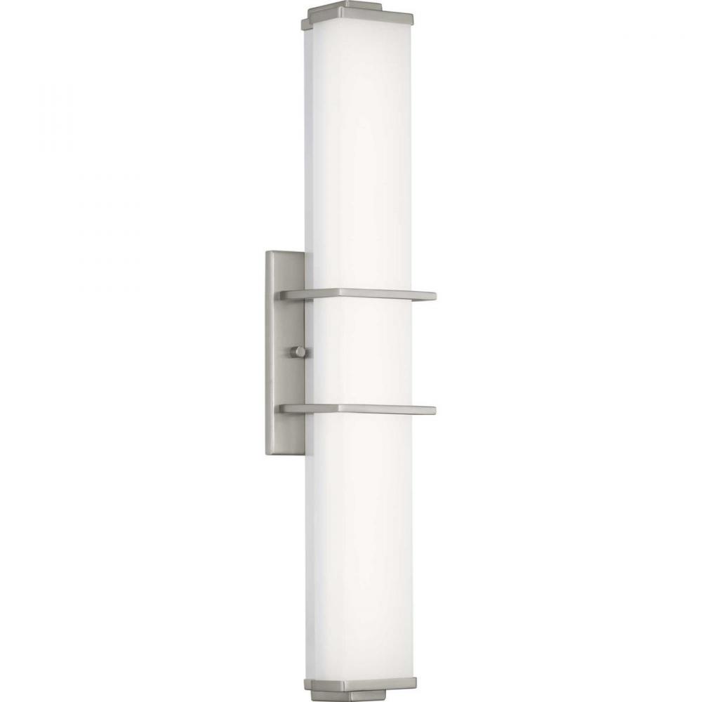 Ideal for a bathroom;Perfect for modern style settings;Beautiful brushed nickel finish;Crisp white acrylic shade;Fixture can mount horizontal and vertical;Includes 1 integrated LED (23 W), 1550 lumens, 3000 K, 90 CRI, dimmable;Measures 24-inch width by 4.
