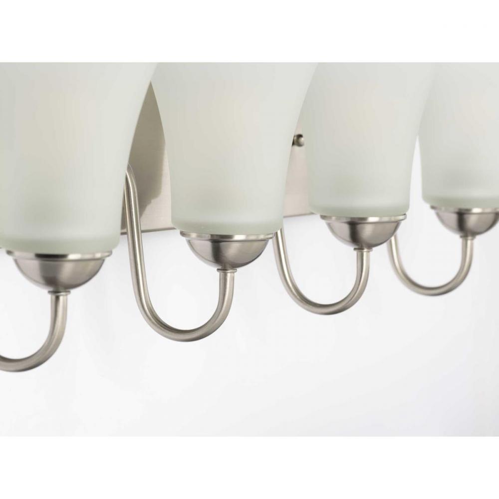 Ideal for a bathroom;Perfect for traditional and transitional style settings;Beautiful brushed nickel finish;Elegant etched glass shades;Mount the light fixture facing up or down;Use 4 medium base bulbs that are sold separately (100 W max - LED/CFL/incande
