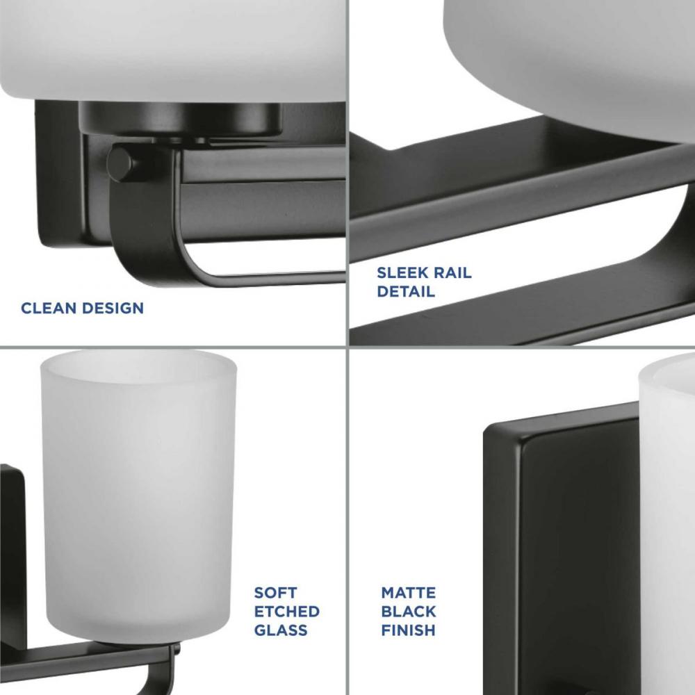 Distinguish your home with clean modern design with the League Collection Three-Light Matte Black and Etched Glass Modern Farmhouse Bath Vanity Light ideal for any bathroom. The crisp backplate and sleek steel rail are coated in a beautiful matte black to create a modern aesthetic. Classic etched glass shades emphasize the contrast between soft and clean.