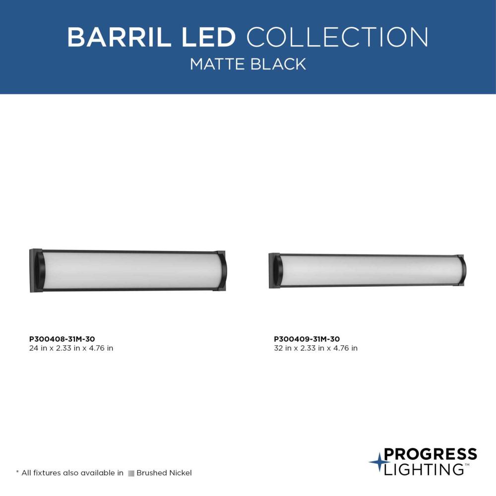 The Barril Collection LED Medium Linear Vanity Light features a rectangular silhouette supported by a slim metal frame coated in a crisp matte black finish. This wall-mounted, durable fixture is given an elegant touch with its rounded, half-cylinder acrylic shade that emits balanced, 3000K 90CRI LED illumination. The vanity light's versatile design is ideal for any bathroom in contemporary or modern commercial or residential settings. Progress Lighting products are designed for exceptional quality, reliability, and functionality.