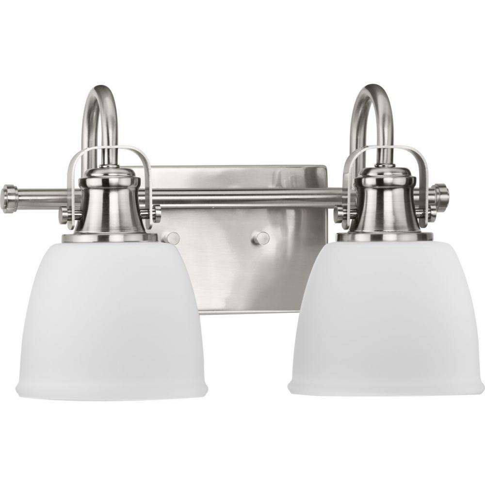 A decorative soft curved metal straps and knobs complement the white opal glass shades providing comfortable illumination