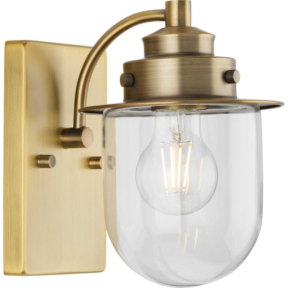The nostalgic Northlake Collection combines classic design influences with nautical inspiration. Finished in vintage brass, the rounded diffuser and layered caps are reminiscent of floating buoys and weekends on a mountain lake. A clear glass shade casts a pleasing glow in bathrooms, powder rooms, hallways and living rooms in coastal and transitional settings. This versatile fixture can be mounted up or down, increasing its design flexibility. It is cULus damp rated and has a one-year warranty to guarantee your complete satisfaction. Progress Lighting products offer exceptional quality, reliability, and functionality. .
