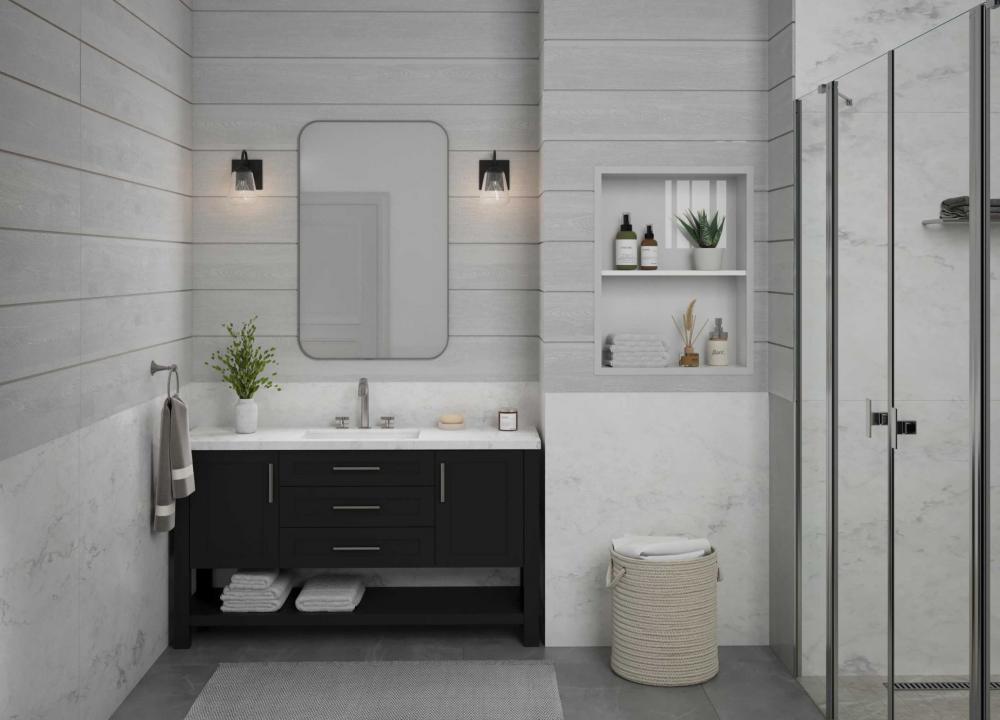 The fixture's simple style perfectly accents modern farmhouse bathrooms