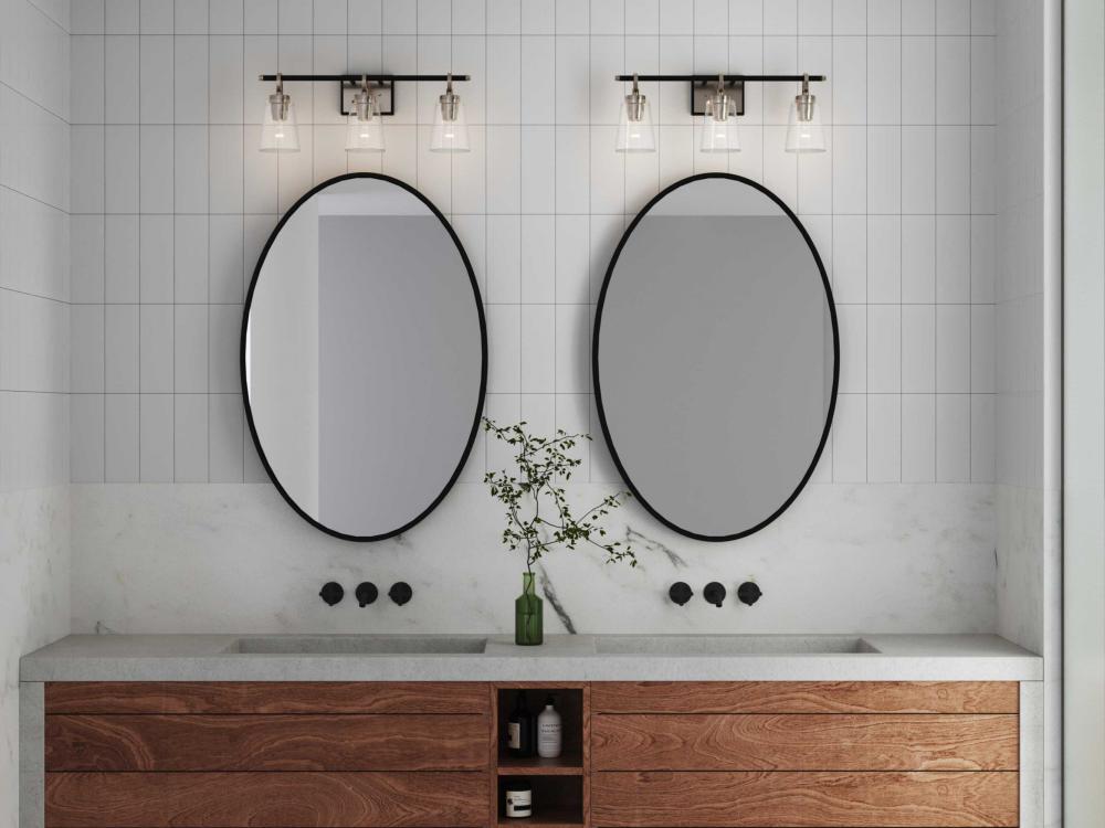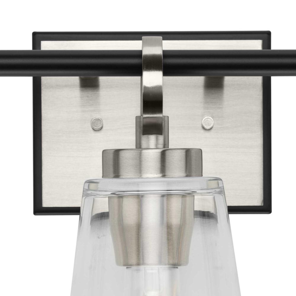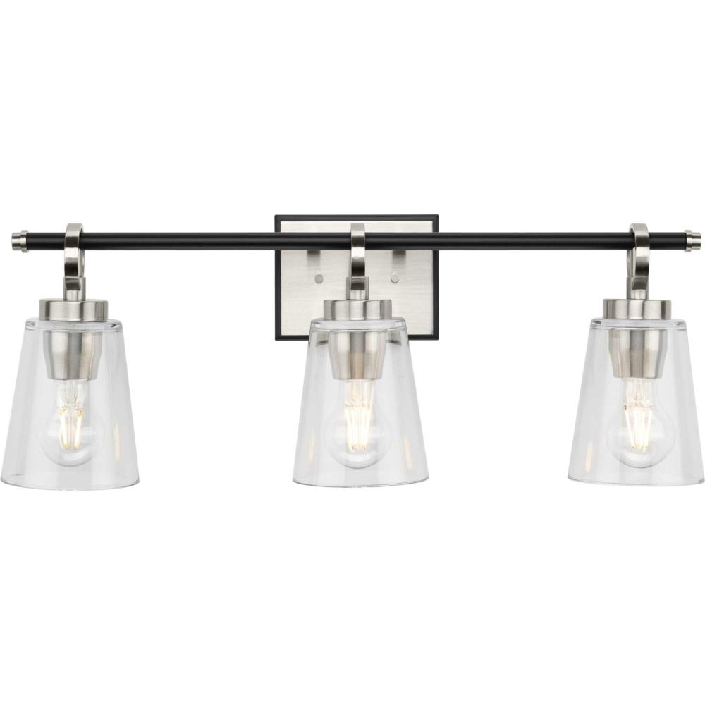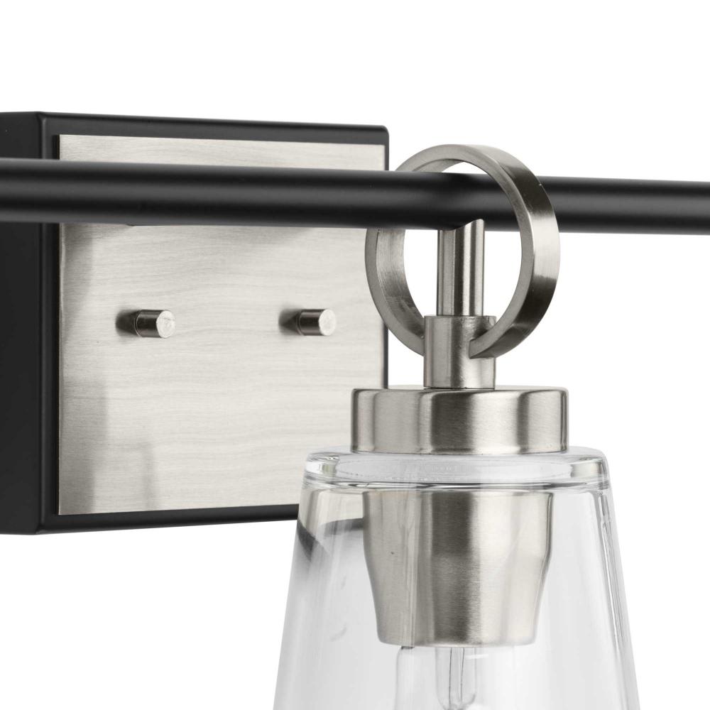 The Cassell Three-Light Vanity Fixture brings an enduring style to the bath. The light boasts a dual-tone finish of Brushed Nickel and Matte Black that accentuates its distinguished and handsome design. Tailored details smoothly blend linear precision with elegant circular rings and clear glass shades.
