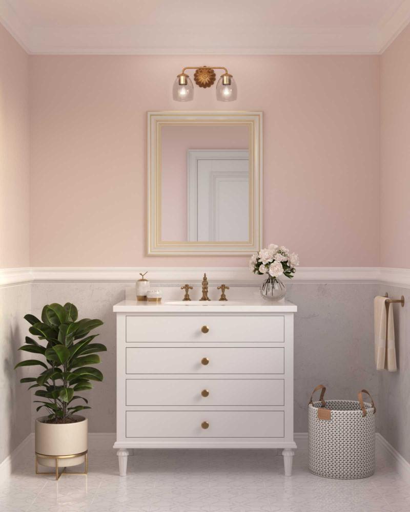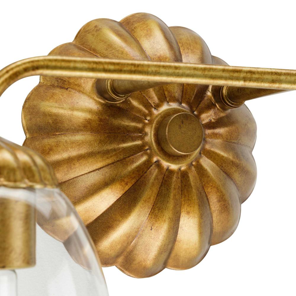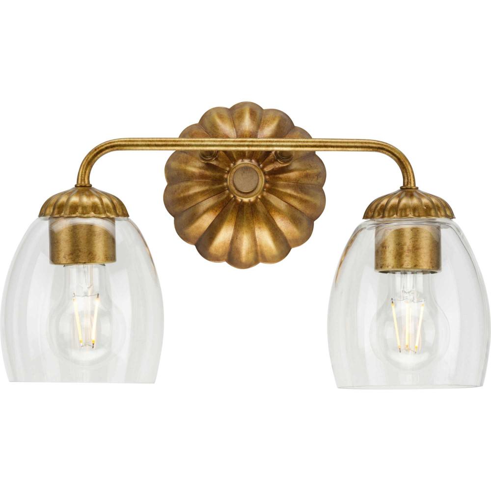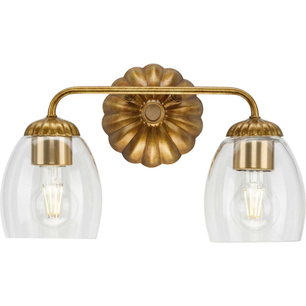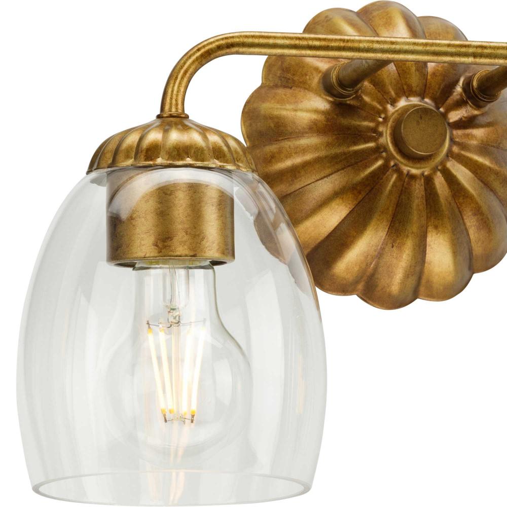 The Quillan Two-Light Vanity Light offers a graceful flourish to add distinctive designer touch. Scalloped elements create a richness of detail to complement the clarity of clear, elliptical glass shades. Each fixture includes both matching and contrasting accent rings. This versatile light can be mounted up or down to provide clear illumination to the room.