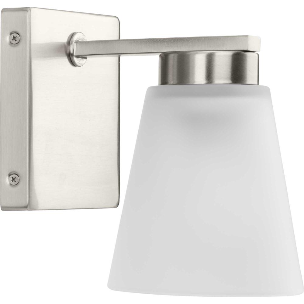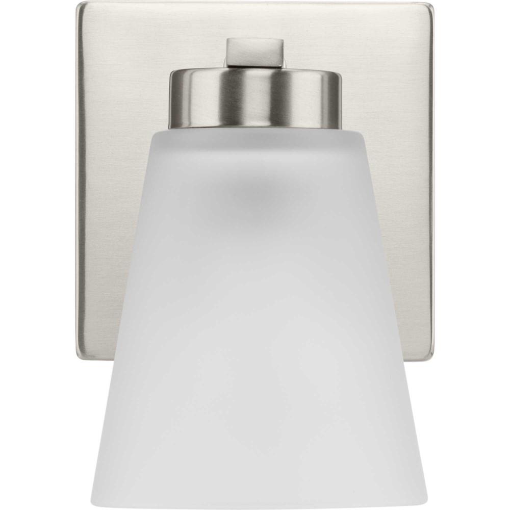 Fill your house with the lively Tanner family of fixtures. Strong lines accent the Brushed Nickel frame in a simple balance of form and function, while a soft etched glass shade complements the design. The versatile fixture can be mounted with the shade facing up or down to suit your preference.