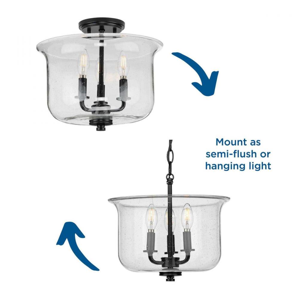 Immerse yourself in a home atmosphere primed for relaxation and inspired thinking with the beautiful craftsmanship of this semi-flush mount. Savor this fresh take on a classic light choice as your gaze traces graceful arms and clean, crisp lines coated in a gorgeous black finish. Lightly seeded glass shade rest in shiny pedestal light bases that add an unexpected, but welcomed dash of modern personality to this clean, traditional design.