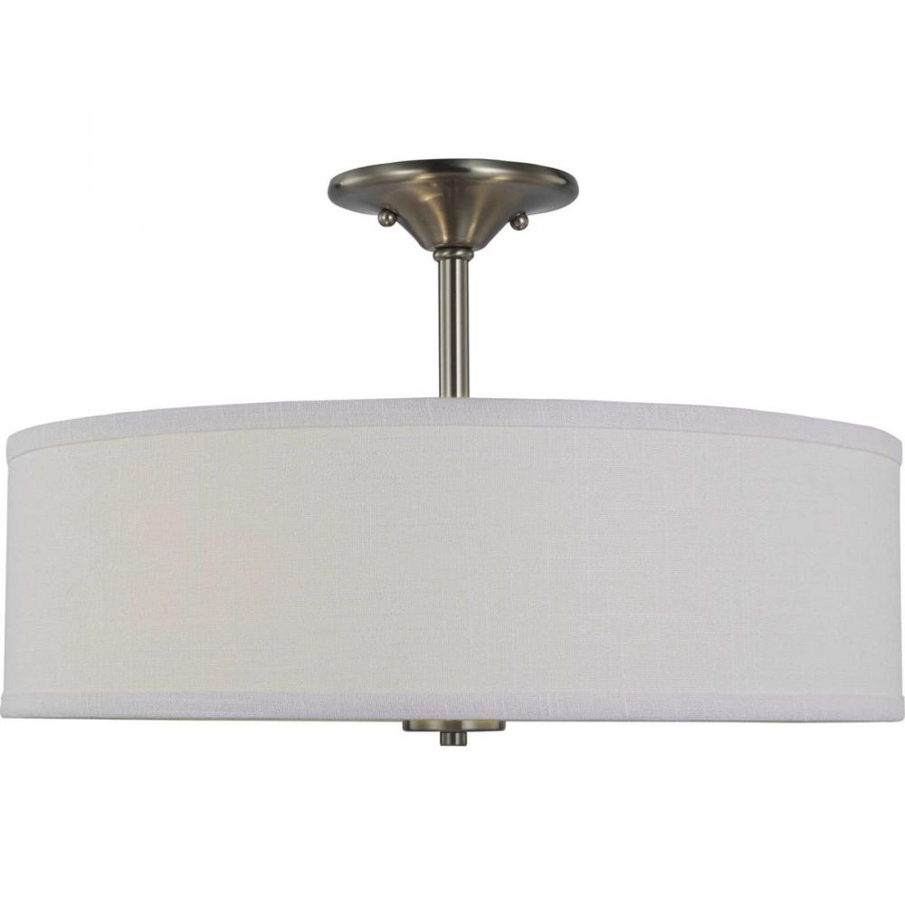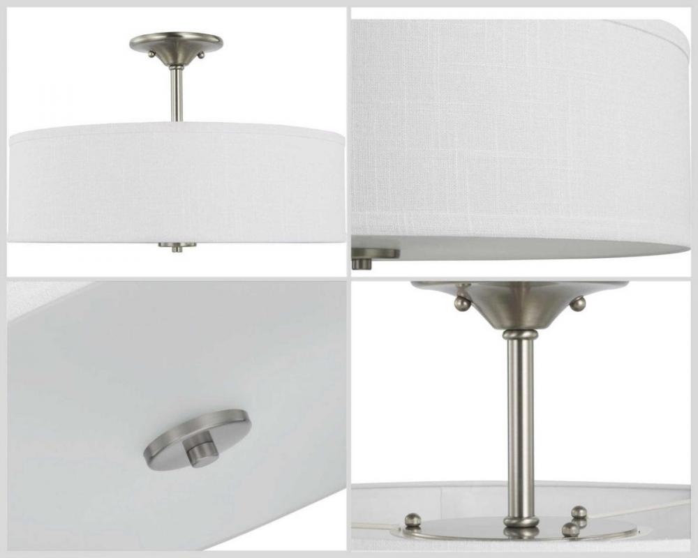 Harkening Back To A Simpler Time, The Inspire Collection Brushed Nickel Three-Light Semi-Flush Mount'S Timeless Demeanor Is Sure To Become A Favorite For Generations. A Round, Summer Linen Shade With An Etched Glass Diffuser Steals The Show And Creates A Beautiful Muted Glow. Understated Metal Accents Complement The Light Fixture As It Fosters A Casual, Friendly Atmosphere.
