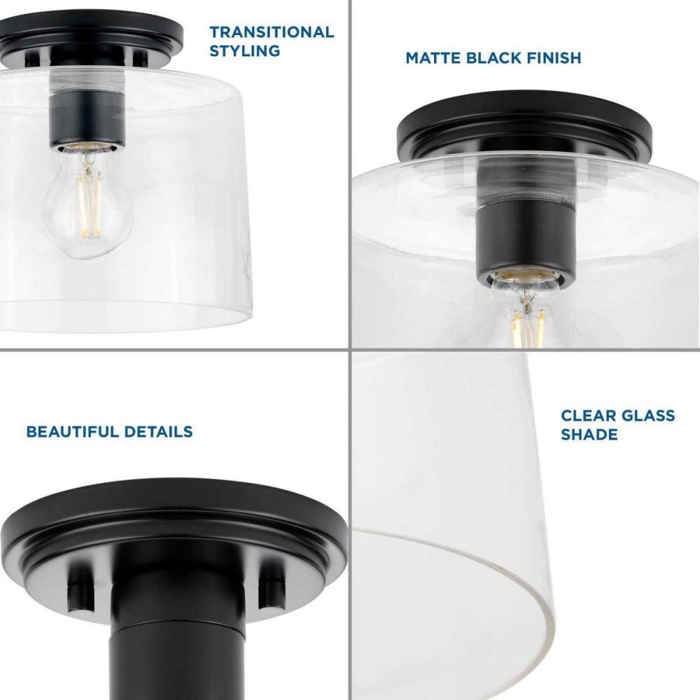 Ideal for a hall, kitchen, bathroom, or foyer;Perfect for new traditional, transitional, and modern farmhouse style settings;Classic matte black finish;Clear glass shade;Includes installation instructions and mounting hardware;Use 1 medium base base bulb t