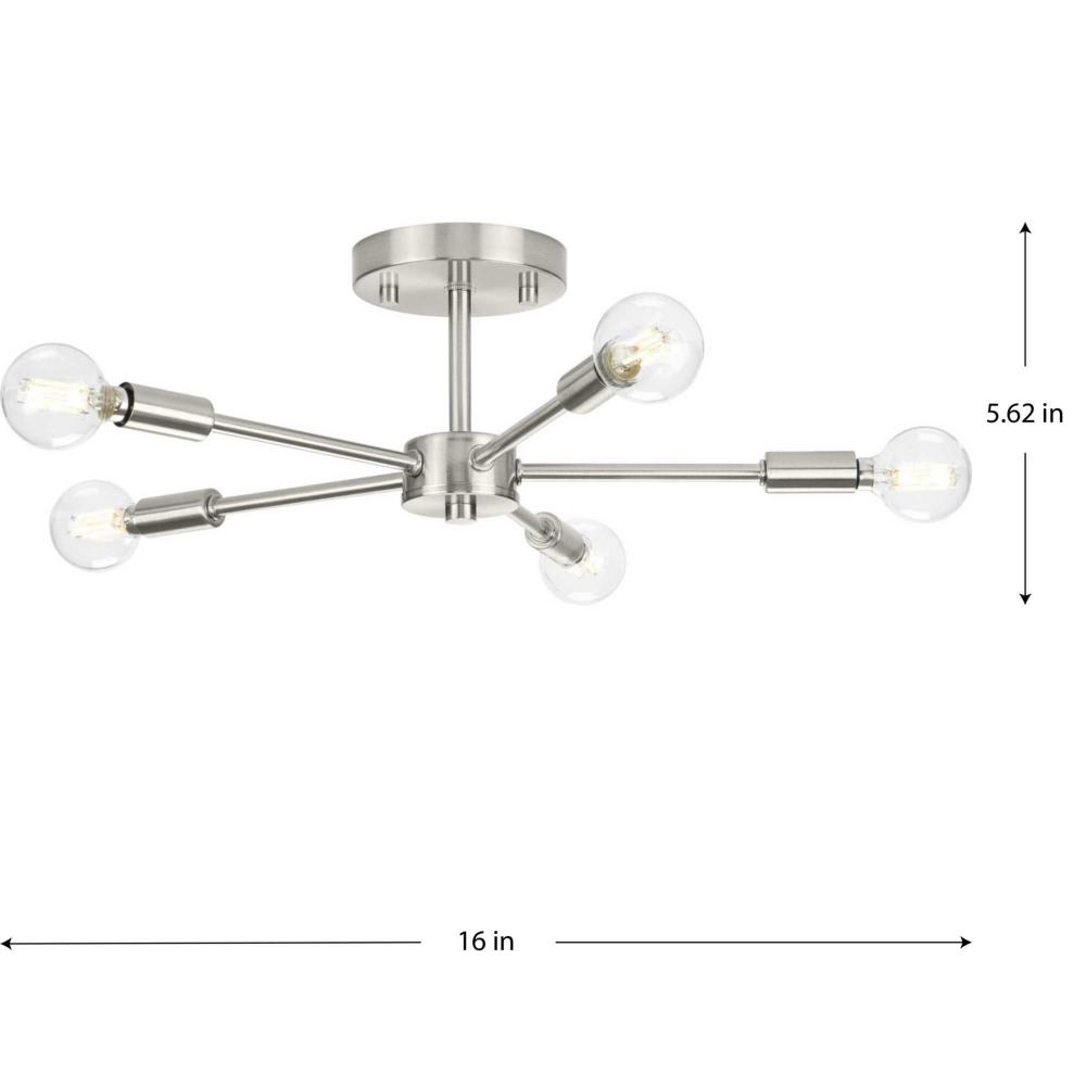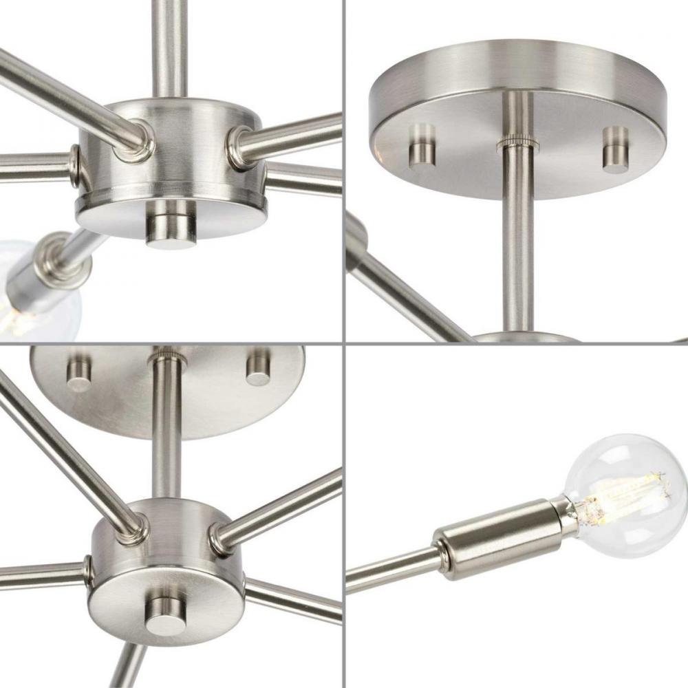 Delayne has a mid-century appeal defined by an array of arms that extend outward from a rounded, central support, making a statement on bathroom, bedroom and living room ceilings;A beautiful brushed nickel finish interacts with the light, creating a light