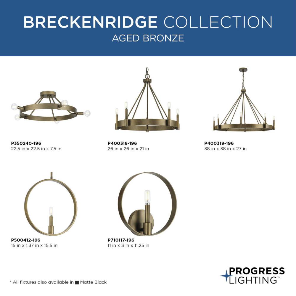 Enhance your interiors with Breckenridge, a rustic yet refined design that presents a statement of minimalist style. Stately candles accent a vast circular frame, illuminating bedrooms, hallways, foyers and living rooms with an inviting glow. Breckenridge is an elegant addition to modern farmhouse and modern craftsman settings. This fixture is part of the Progress Lighting Design Series, a lighting collection offering fashionable styles and affordable luxury lighting for the home.
