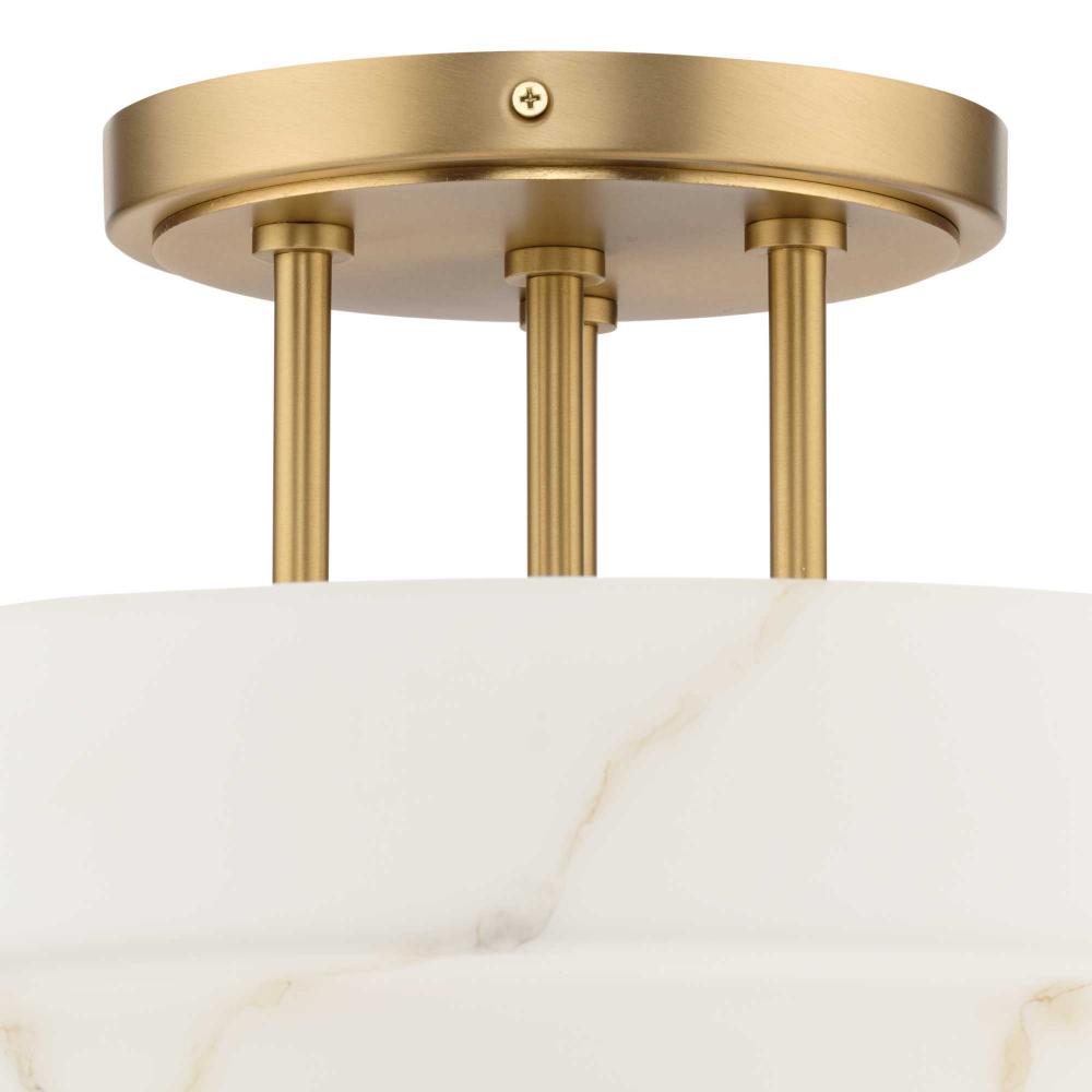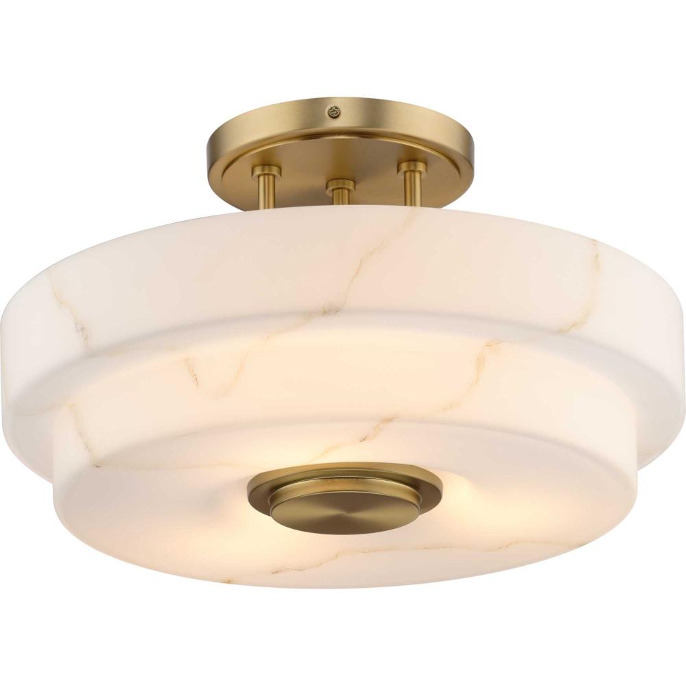The Tosca Collection semi-flush mount ceiling light features a Brushed Bronze finish with tiered round glass shade crafted with a faux alabaster finish that radiates patterns of light and shadow, adding depth and warmth that enchant any room. This fixture is part of the Progress Lighting Design Series, a lighting collection offering fashionable styles and luxury lighting for the home.