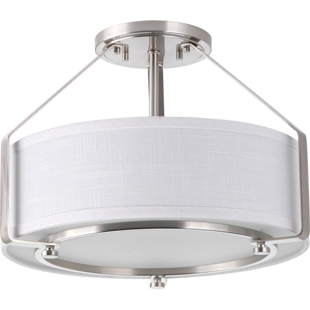 The three-light semi-flush offers a sleek metal frame that supports a low-slung shade to create Ratio’s casual modern style. The frame’s proportion to the white linen drum shade evokes a perfect ratio for lighting. Includes a polished glass exterior, etched glass interior diffuser that offers an elegant appeal and is easier to clean – offering both fashion and function. This fixture can be mounted as a semi-flush or used as a hanging pendant for a wide variety of applications. Brushed Nickel finish.