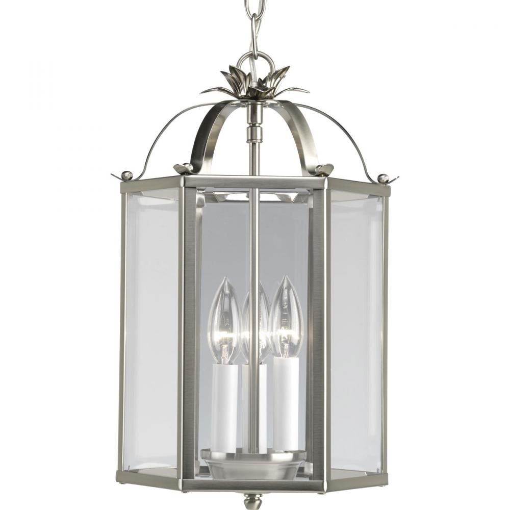 Brushed Nickel finish.;Clear flat glass panels.;Chain or ceiling mount.