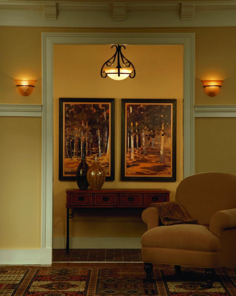 Forged Bronze finish.;Tea-stained glass bowl.;Distinctive ebbing and flowing of scrolls and arms.;Chain and ceiling mounts both included.