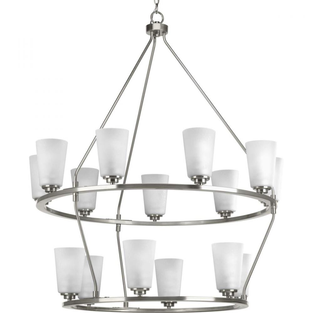 A new category of vintage modern fixtures takes center stage with this two-tier, fifteen-light chandelier from one of our Design Series collections. Delicate details in a Brushed Nickel finish, create statement making focal pieces for a variety of interiors. Debut provides a fitting stage to feature nostalgic, vintage lamps. Glass accessory shades available in clear or frosted seeded finishes.