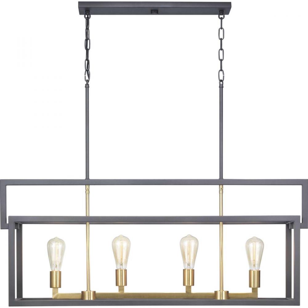 The Blakely collection four-light linear chandelier is a fashion-forward design style. A rectangular frame celebrates geometric interplay with clean, straight lines. Finished in Graphite with satin brass accents, the Blakely collection is ideal for Modern and Traditional interiors.