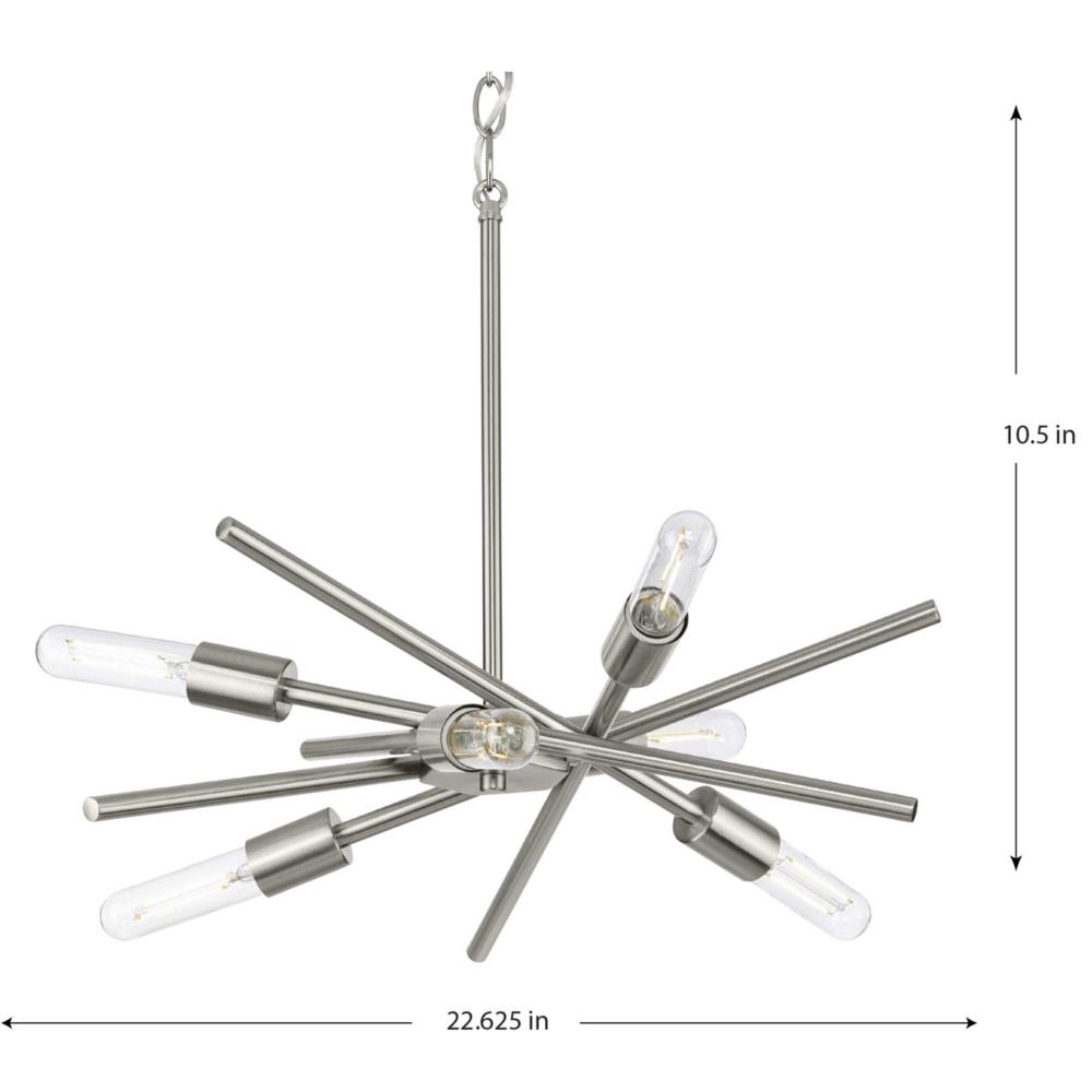 An iconic style design that adds dynamic flair to any room;Versatile space-aged inspired pieces that can be incorporated into a variety of interiors;Brushed Nickel finish;Chandelier uses six 60W max. medium base bulbs (sold separately);Perfect showcase for