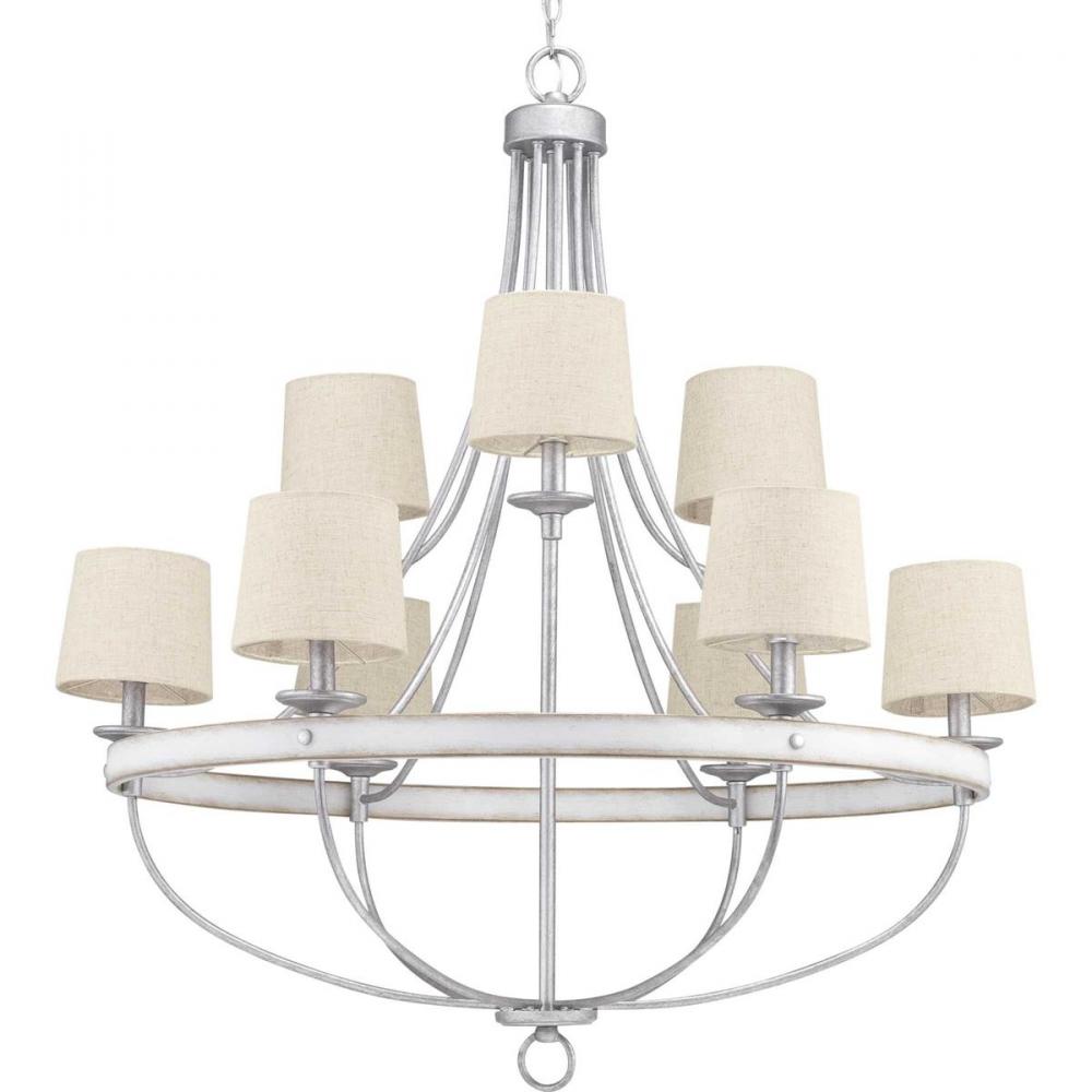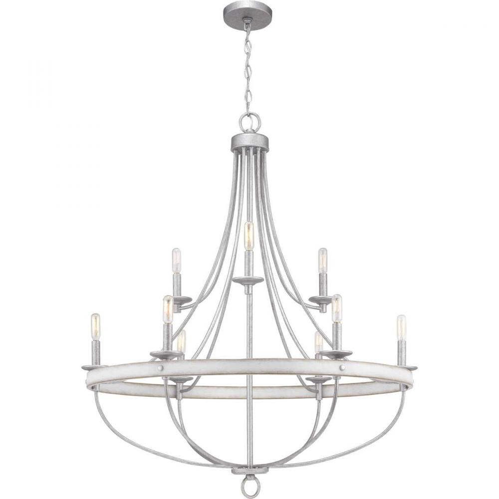 The nine-light chandelier in the Gulliver Collection features arching and delicate details that curve to create an airy design. Dual toned frame color combinations in a Galvanized finish with antique white accents The hand painted wood grained texture finished to emulate weathered driftwood complements Rustic and Modern Farmhouse home decor, as well as Urban Industrial and Coastal interior settings.