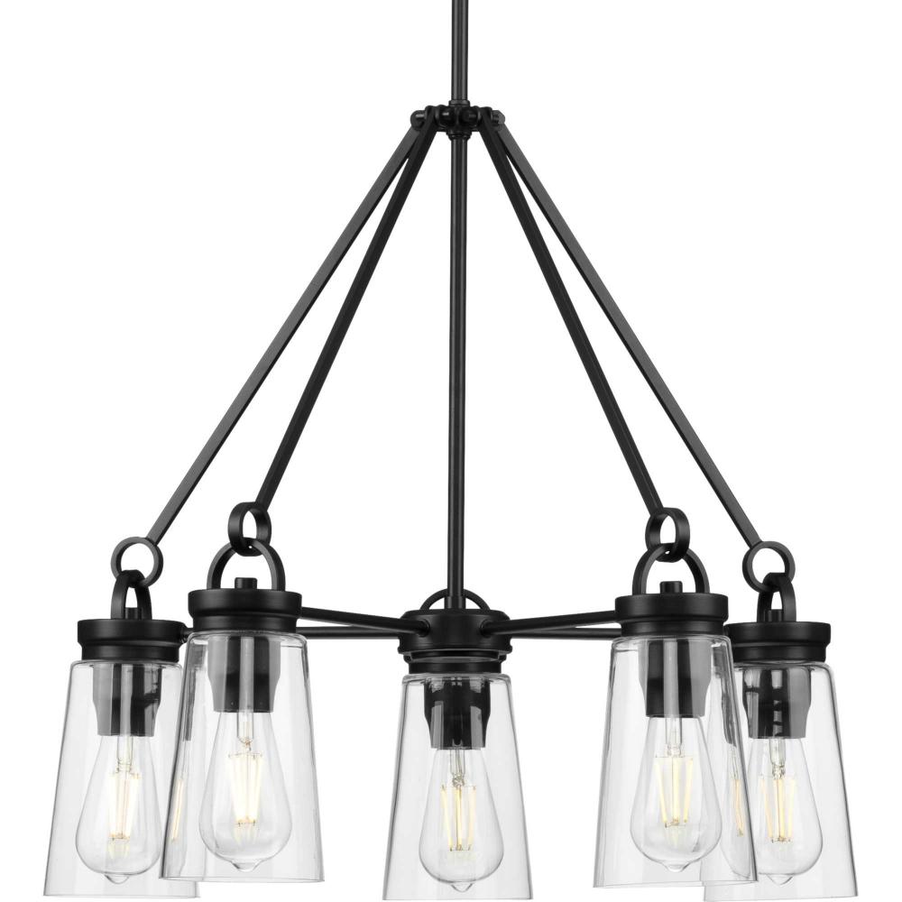 Inspired by traditional post-and-beam construction, the Stockbrace Collection 5-Light Matte Black Clear Glass Farmhouse Chandelier Light. Clean lines, an open design, and architectural details are coated in a classic matte black finish. Light sources illuminate clear glass shades to complete the clean design.