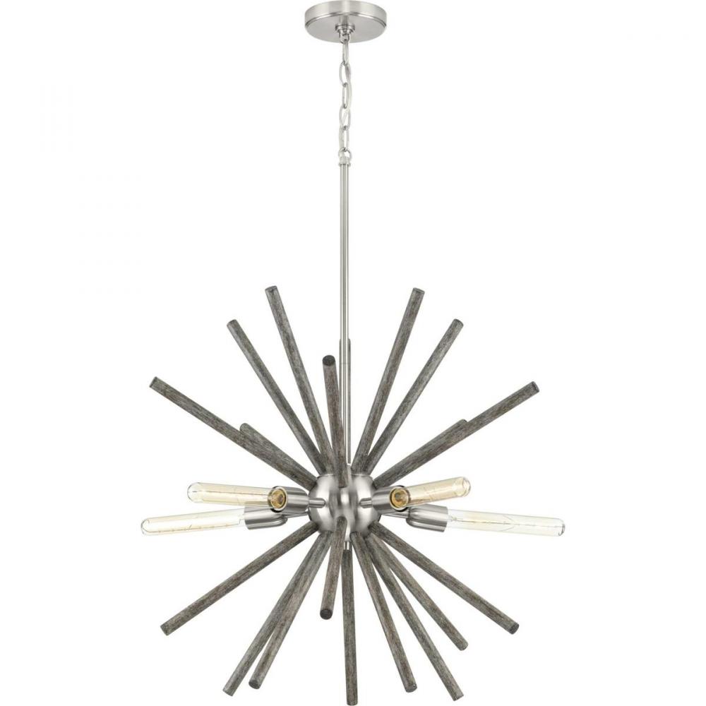 Fall in love with the starburst form reinvented by a rustic twist with the Thorpe Collection 5-Light Brushed Nickel Mid-Century Modern Chandelier Light. Angular lines coated in a faux Barnwood finish are accented by a beautiful brushed nickel center and smooth stem. Light sources extend from the center in a circular fashion for a softer, playful ambiance.