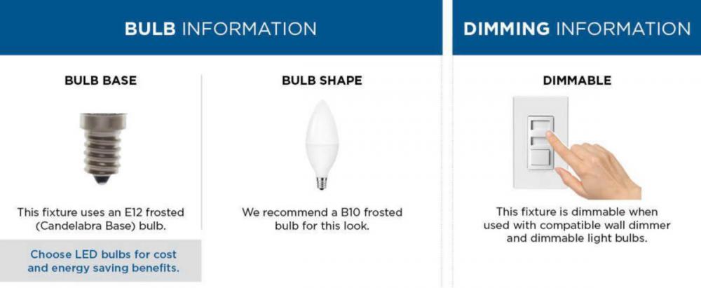 Uses (4) 60-Watt maximum candelabra (G 16.5) base bulbs, or LED equivalent, that is sold separately, dimmable when used in conjunction with a dimmable bulb