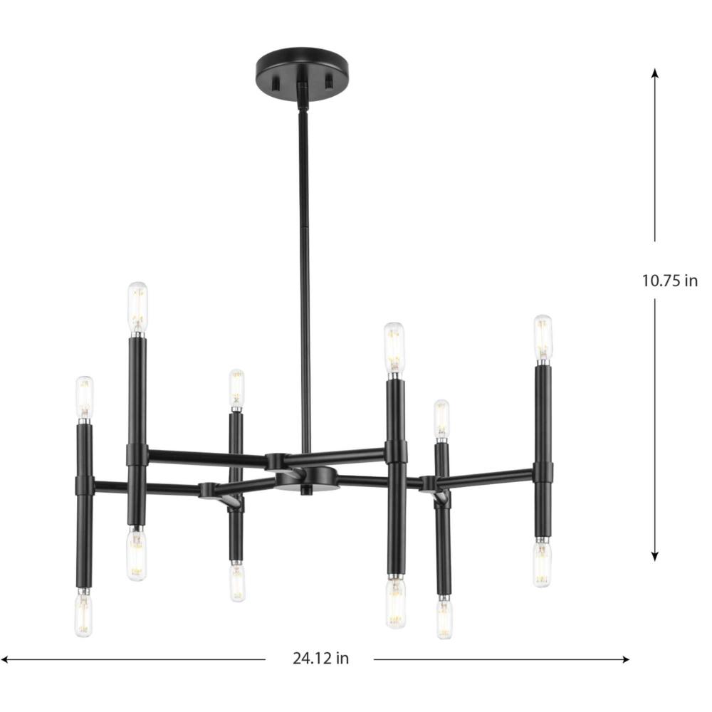 The Arya Collection has a lively essence created by the rhythm of slender, graceful features. The style offers modern appeal with understated elegance.Staggered arms coated in an elegant matte black are suspended from a central axis, defining this bold architectural form. The impressive chandelier brings a modern flair to ceilings in dining rooms, bedrooms and living rooms in luxe, mid-century modern and contemporary settings. This fixture is part of the Progress Lighting Design Series, a lighting collection offering fashionable styles and affordable luxury lighting for the home.