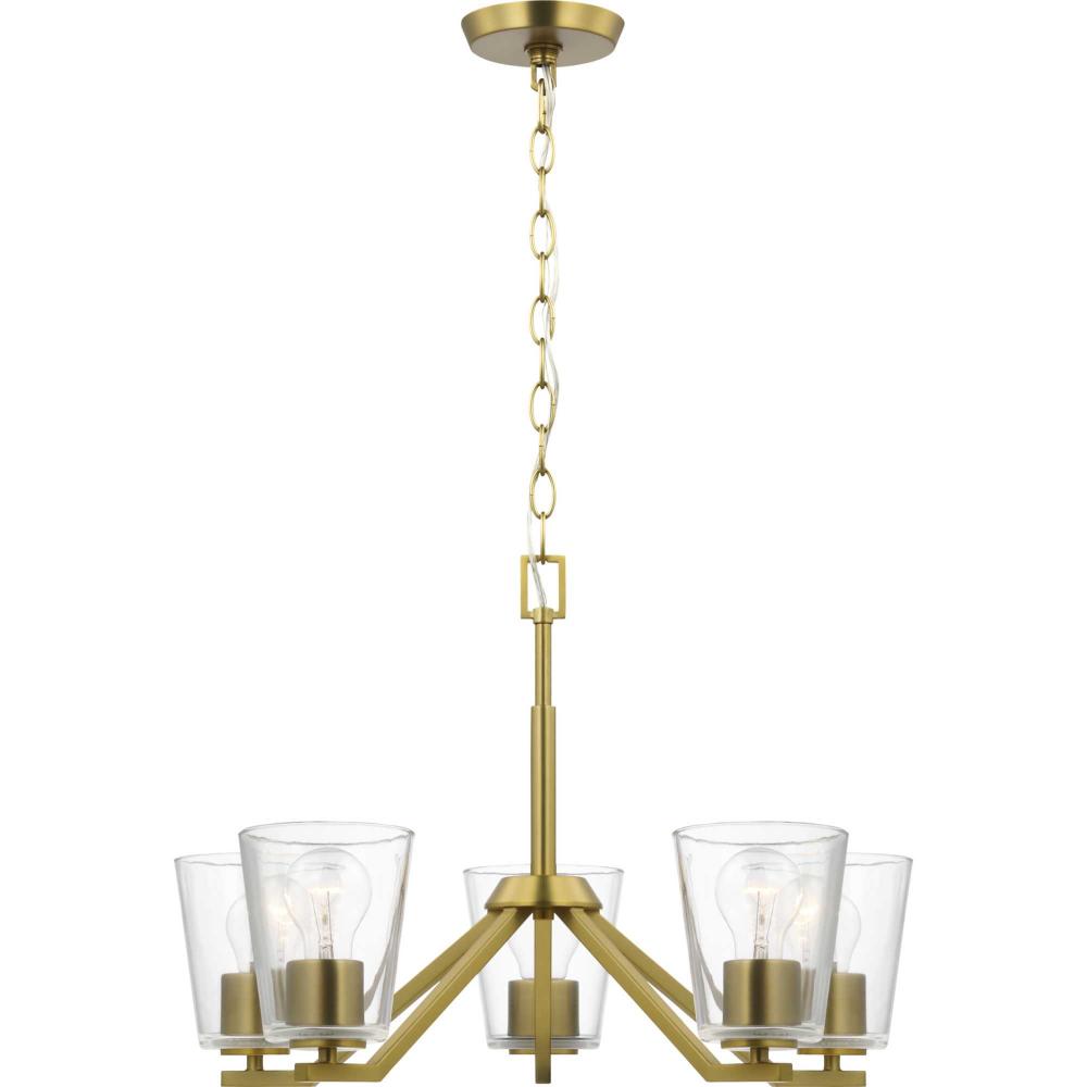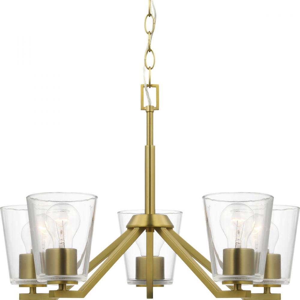 Elegantly extended, the Vertex chandelier is composed of angular forms to create a bold design that perfectly complements dining rooms and living rooms in modern interiors. Its distinctive silhouette is coated in a soft brushed gold finish. A clear glass shade offers bright illumination to spaces below. Customize the chandelier's hanging height to your ceiling using the Included 48 in. of chain for a variety of ceiling heights and sloped ceilings.