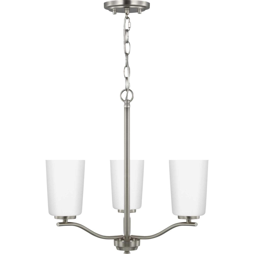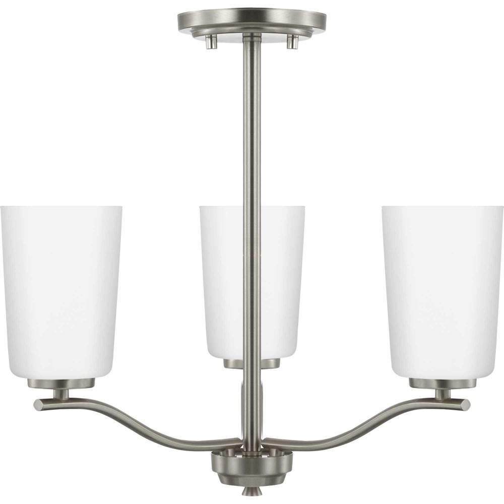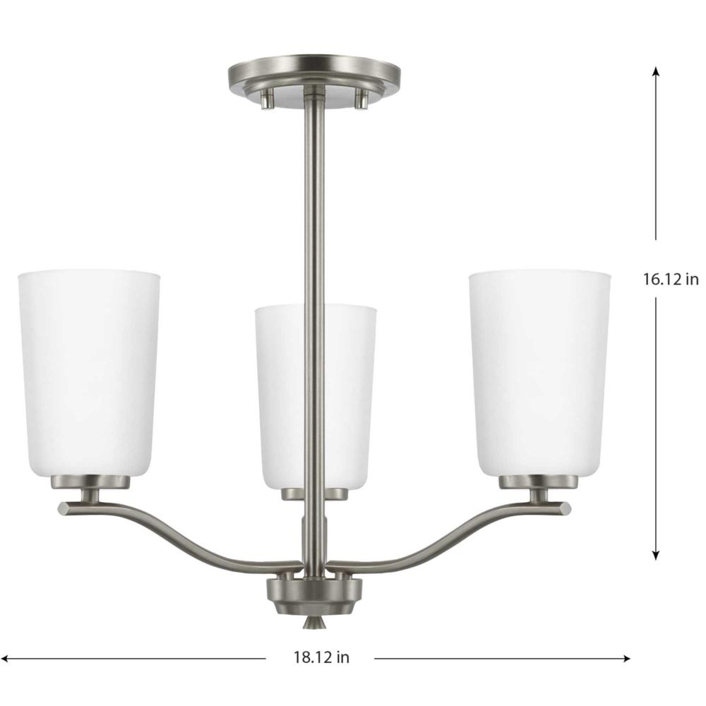 Fundamentally modern but with a traditional twist, the Adley semi-flush convertible chandelier combines etched white glass shades with a curved arms and simple, straight bars finished in brushed nickel. This light is an elegant choice for illuminating kitchens and breakfast nooks in transitional settings and contemporary settings. The fixture has 48 in. of chain to customize it for a variety of ceiling heights and can be used on a sloped ceiling.