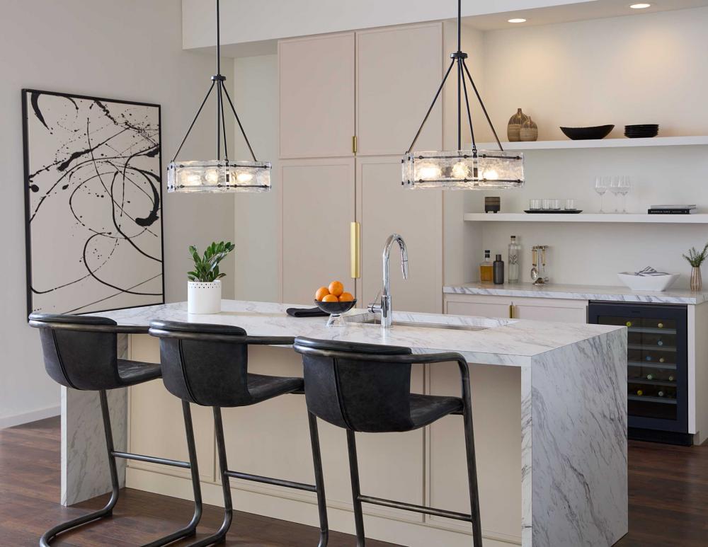 Linear elements and clear, textured glass accent modern farmhouse, luxe and urban industrial designs