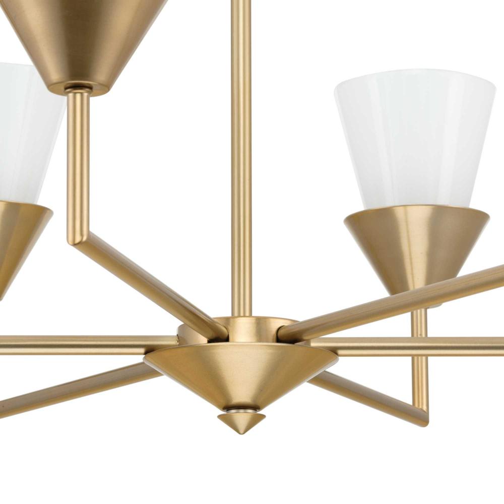 The Pinellas Chandelier gets to the point with a modern expression of a timeless form. The signature dual conical motif has the elements artfully nested together to provide a pleasing diffusion of light from its opal glass shades. This fixture is part of the Progress Lighting Design Series, a lighting collection offering fashionable styles and affordable luxury lighting for the home.
