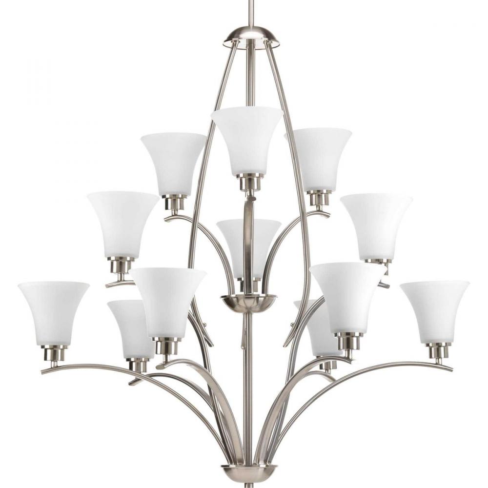 Gleeful simplicity defines this twelve-light, three-tier chandelier from the Joy Collection. Refreshing and fashionable arcing forms of Brushed Nickel metal arms enhance the etched white fluted glass. Coordinating fixtures from this collection let you decorate an entire home with confidence and style. Unique stem-hung construction carries the clean line all the way to the ceiling and, for sloped ceilings, ten feet of 9 gauge chain is provided to allow the fixture to hang straight and level.