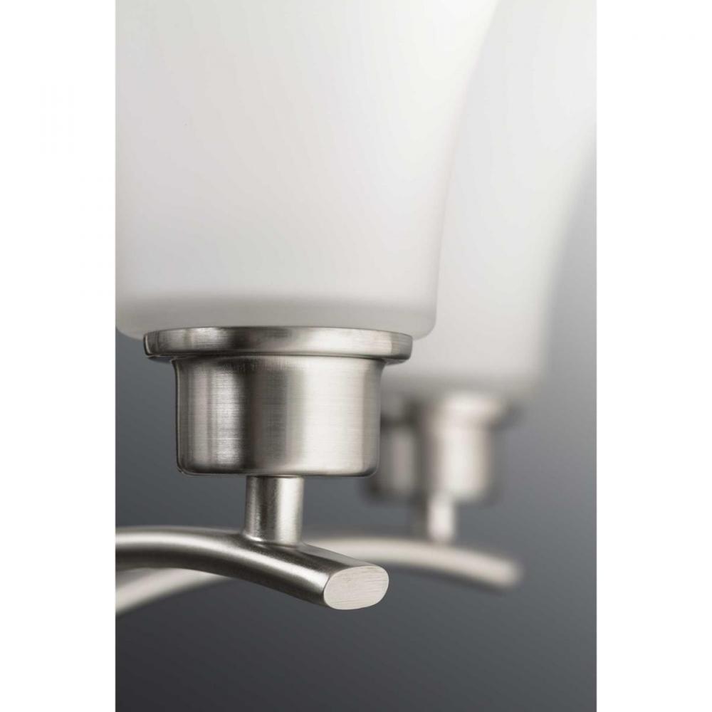 Brushed Nickel finish.;Graceful arcing forms of metal arms and linear elements.;Etched white fluted glass.;Coordinating fixtures from this collection.;Includes two 6" stems and 120 in of chain.