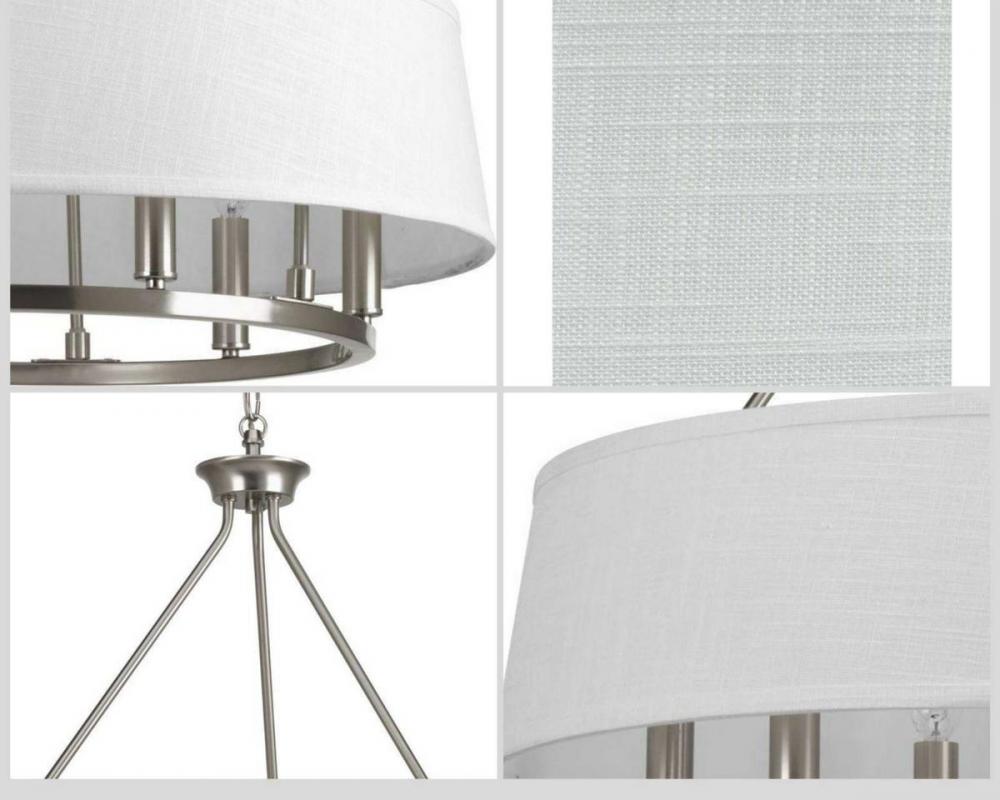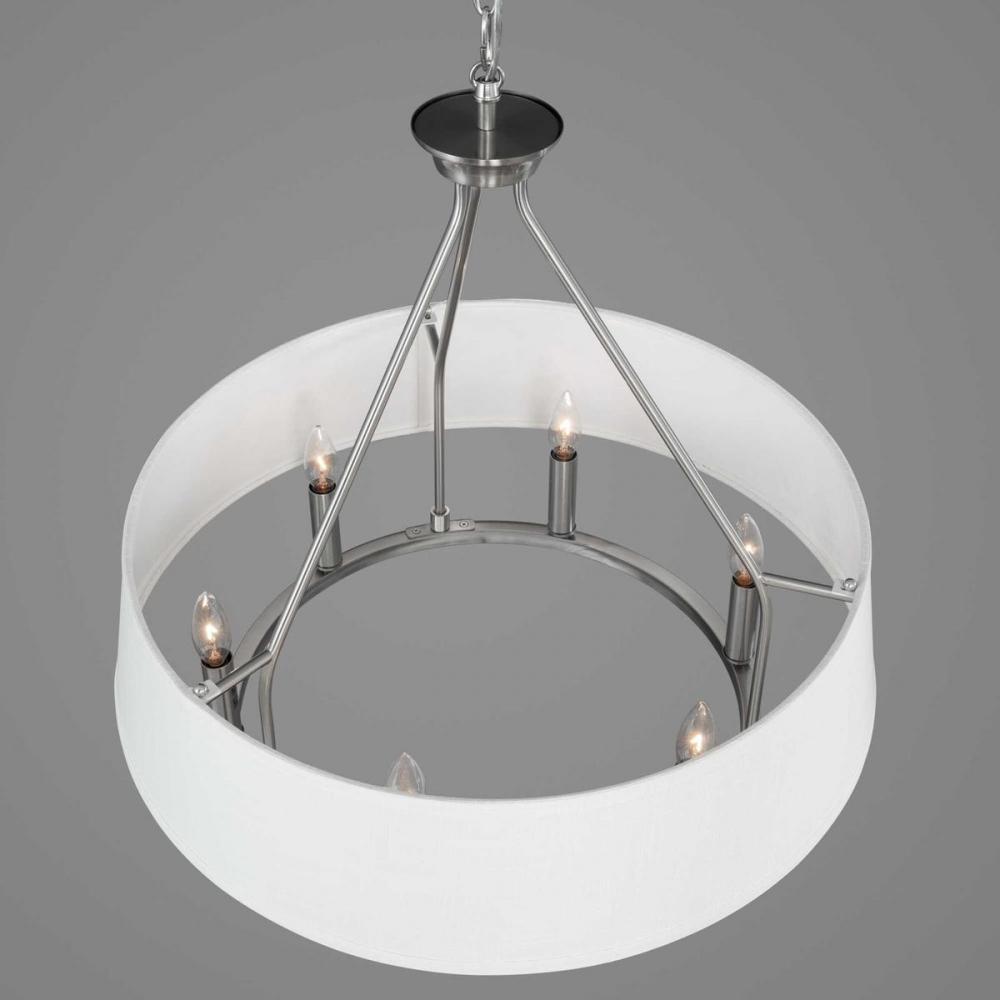 The Cherish 6-light chandelier is a modern take on a classic silhouette. A simple round frame is coated in a soft brushed nickel finish and topped with six columns holding candelabra base bulbs. An elegant summer linen drum shade surrounds the frame. Soft light is cast downward onto the surface below. This lovely chandelier is a focal point for dining rooms or great rooms in coastal, traditional and various other settings.