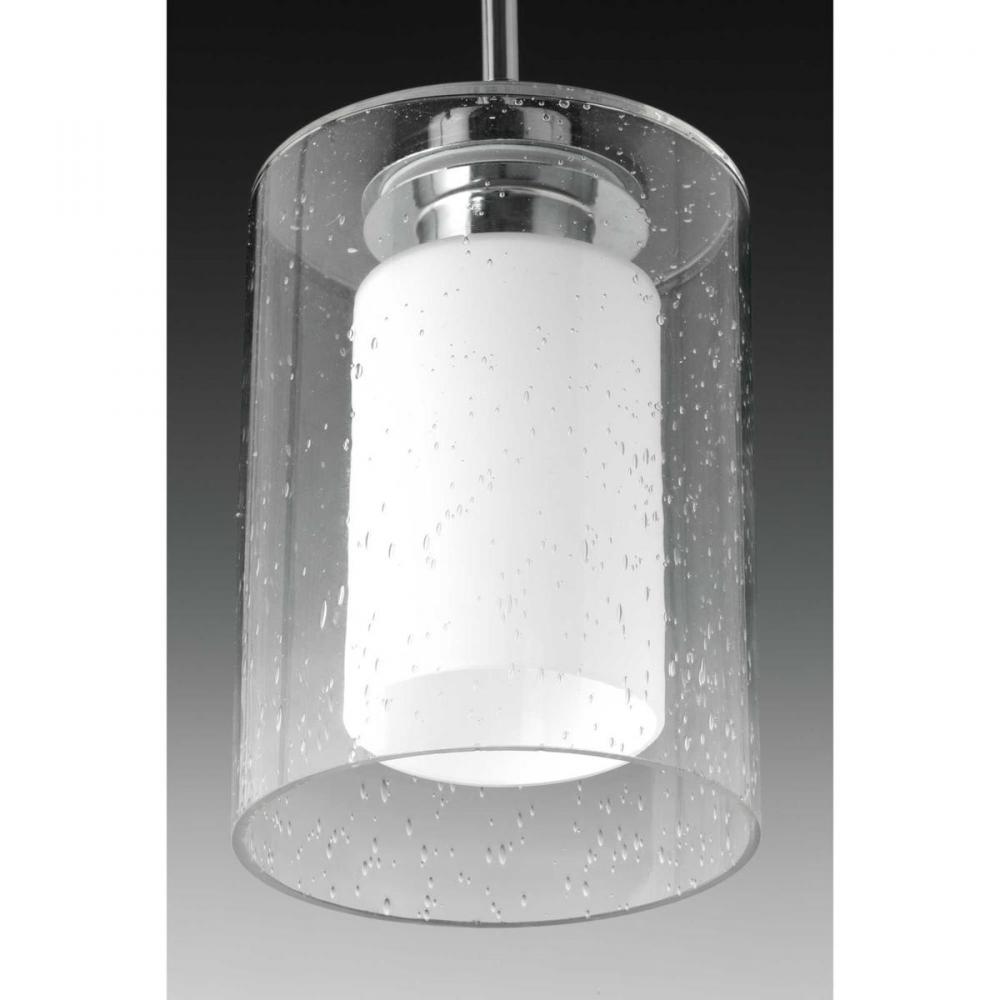 Create a focal point with the Double Glass mini-pendant's vintage-inspired silhouette. Oversized clear seeded outer glass with an inner etched white glass shade complements linear forms in a Polished Chrome finish. Polished Chrome finish. Polished Chrome finish.