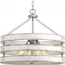 Three circular bands wrap together to create an open design in Gulliver four-light pendant. A hand painted wood grained texture complements Rustic and Modern Farmhouse home decor, as well as Urban Industrial and Coastal interior settings.