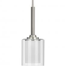 Add a modern romance to the heart of your home with this lovely mini-pendant. Quiet etched glass diffuser are surrounded by clear outer glass shade for a soft, luxurious touch. The shades are on an elegant graphite frame suspended from a square arm.