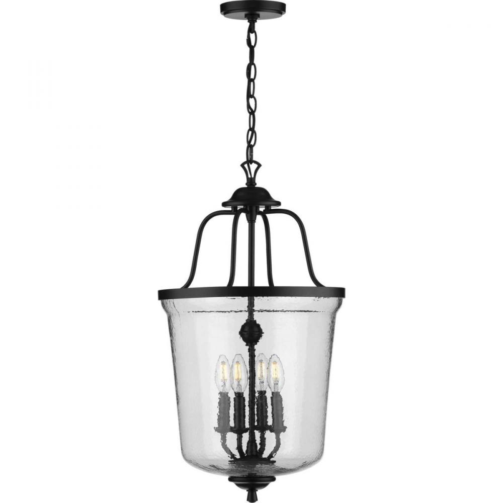 Beautiful lighting will appeal to both your classic taste and your artistic spirit with the Bowman Collection Four-Light Black Pendant. Wandering eyes will focus on the clear, chiseled glass shade that encircles four elegant light sources gathering quietly at the light fixture's center. Handsome, black light bases with sophisticated curved arms originate from a decorative black knob that embellishes the outer bottom of the textured glass shade.