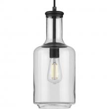 Introduce a pop of personality into your home with this pendant. A round ceiling plate coated in a brushed nickel finish anchors the pendant in place as the light source hangs below. A bottle-inspired clear glass shade adds a twist to a simple industrial style that brings this light fixture's vintage charm to the forefront of your home's lighting design.