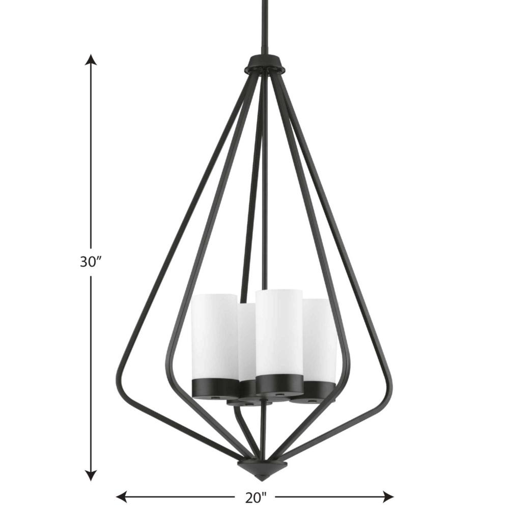 Achieve a sleek and modern look with the Elevate Collection 4-Light Matte Black Etched Glass Modern Pendant Hanging Light. An angular frame coated in a classic matte black finish that accentuates the design's modern aesthetic. The frame captures the crisp etched white glass cylindrical shades for elegant illumination.