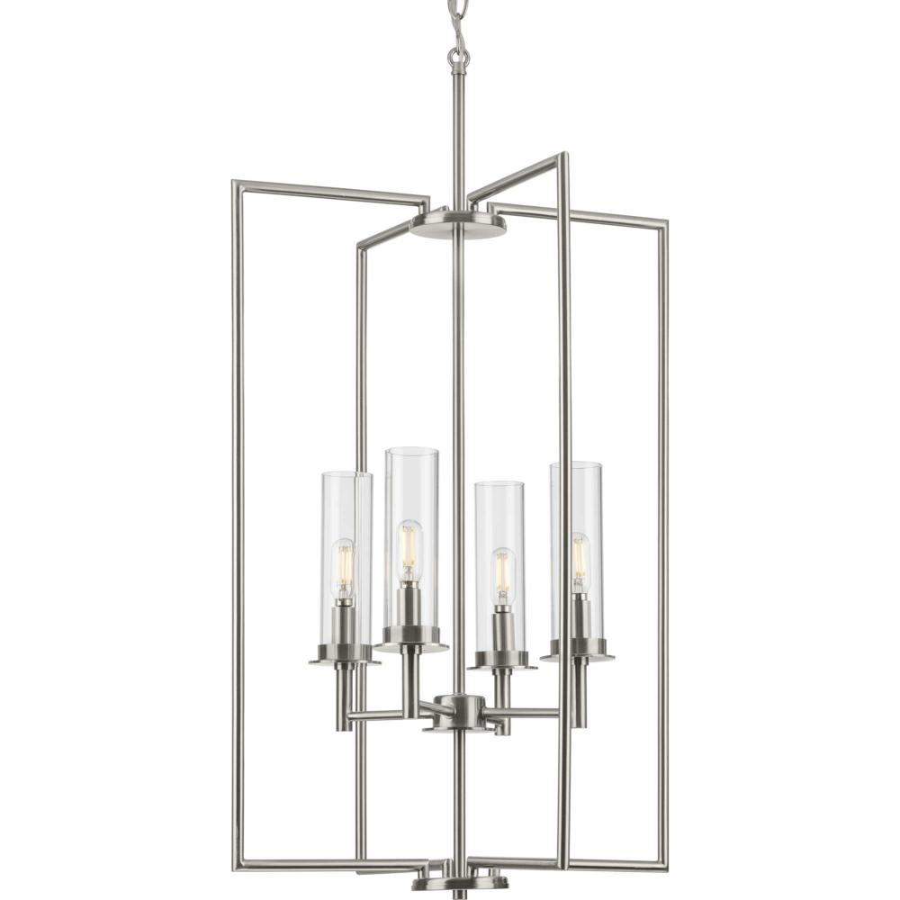Balance the best of modern and traditional with the Kellwyn Collection 4-Light Brushed Nickel Clear Glass Transitional Foyer Pendant Light. The classic cage design is composed of crisp, clean lines coated in a beautiful brushed nickel finish for a touch of luxury. Light sources glow within clear, cylindrical glass shades for luxurious illumination.