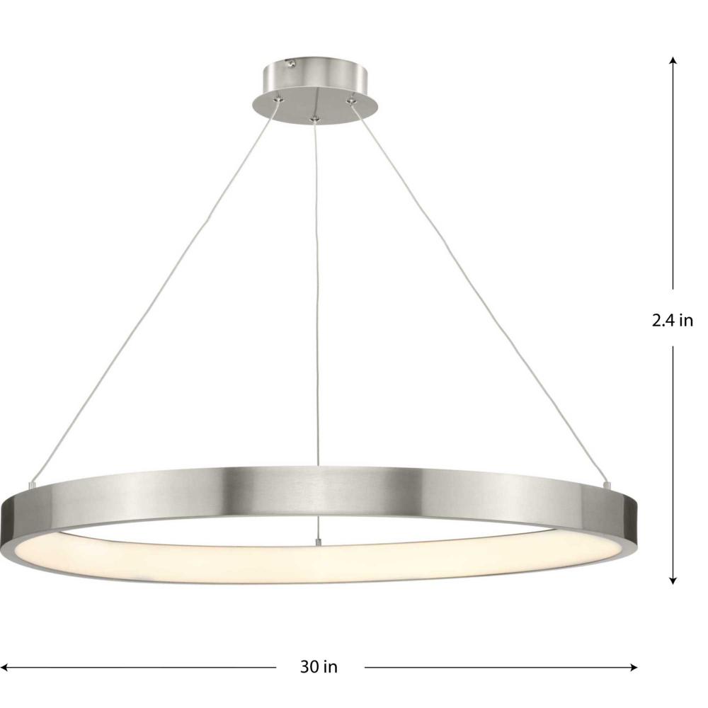 A simple halo finished in soft brushed nickel is suspended by airy cables, bringing a minimal contemporary style to Inverse LED. Indirect illumination provided by integrated LED light sources creates an inner glow that gently lights the surroundings. This sleekly styled fixture is ideal for modern, mid-century modern and contemporary interiors.