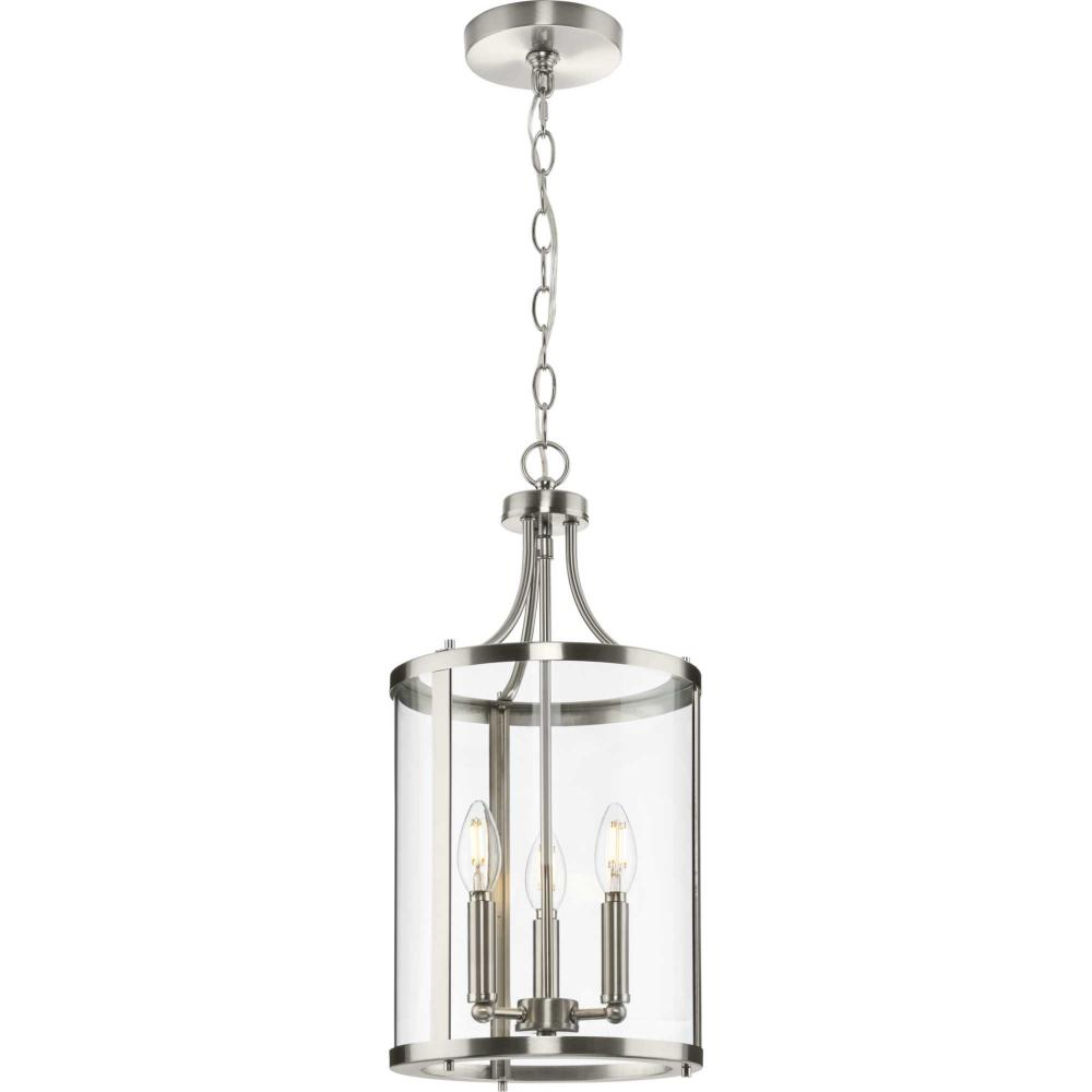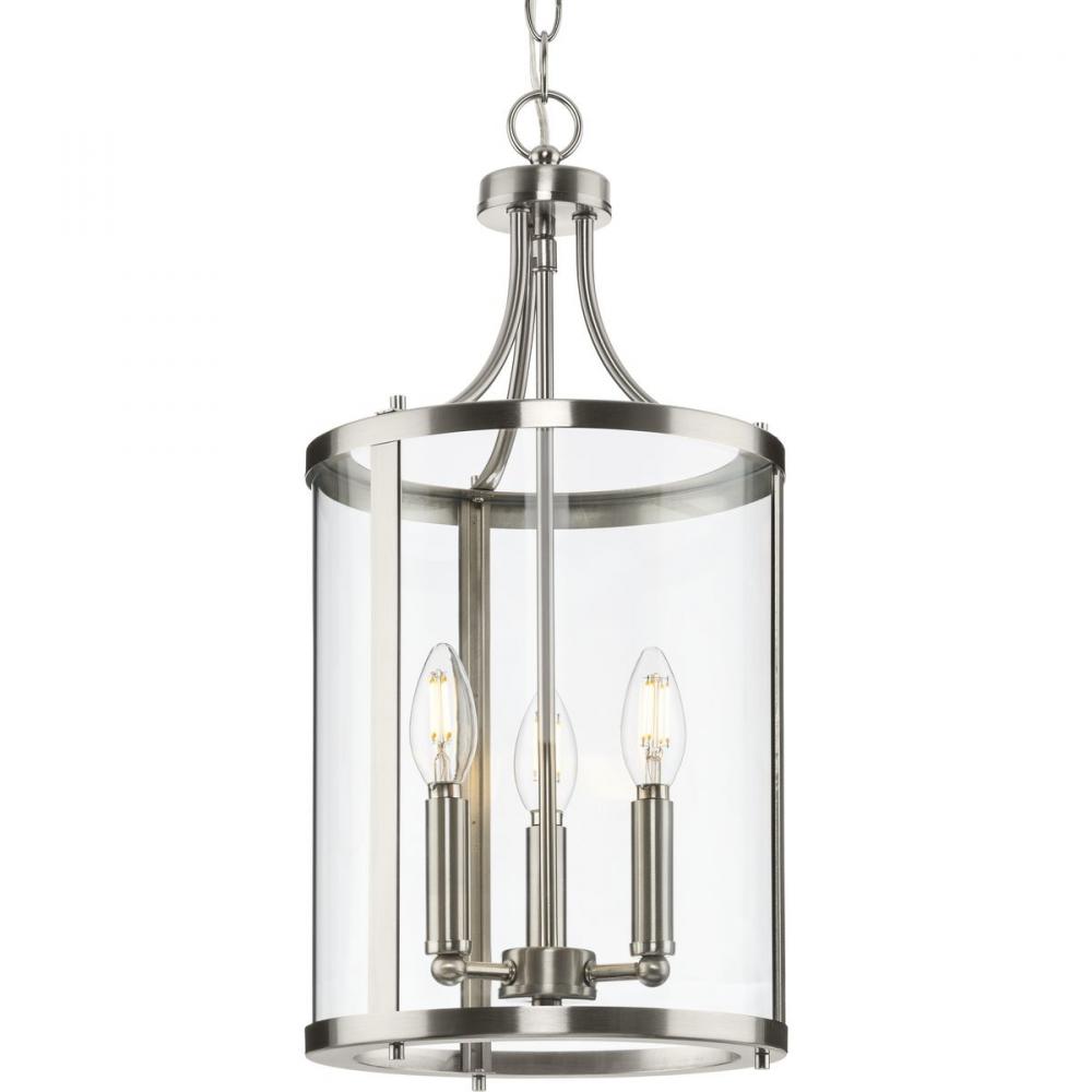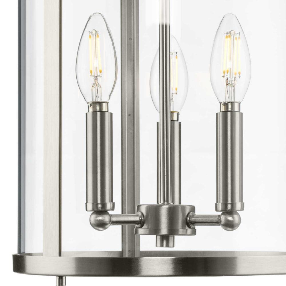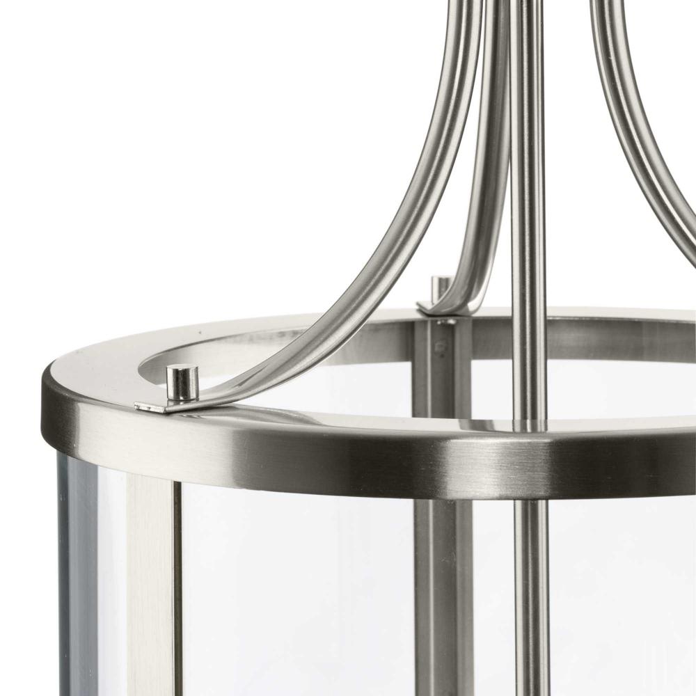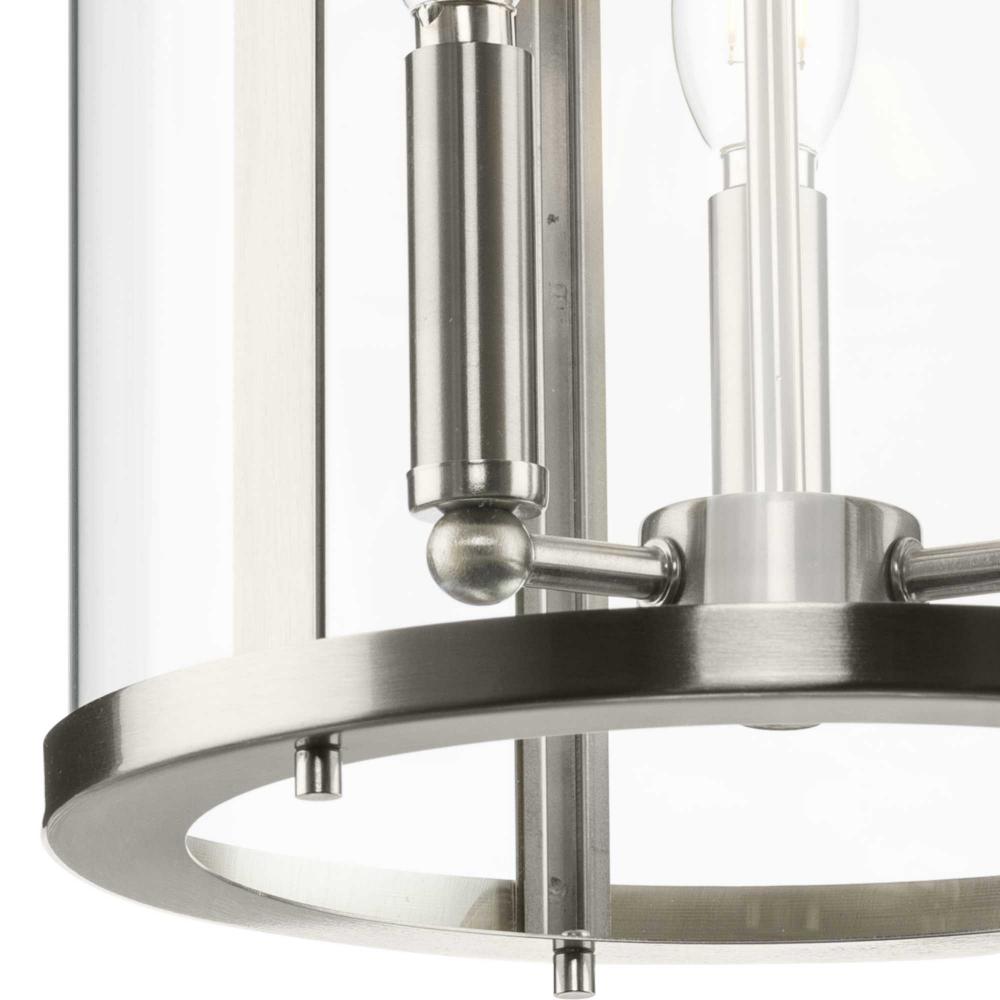 The fixture is coated with a subtle brushed nickel finish, adding a beautiful statement to halls and foyers