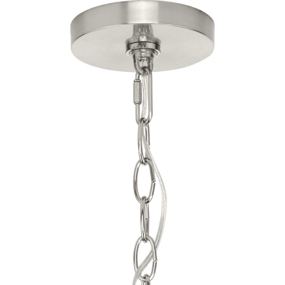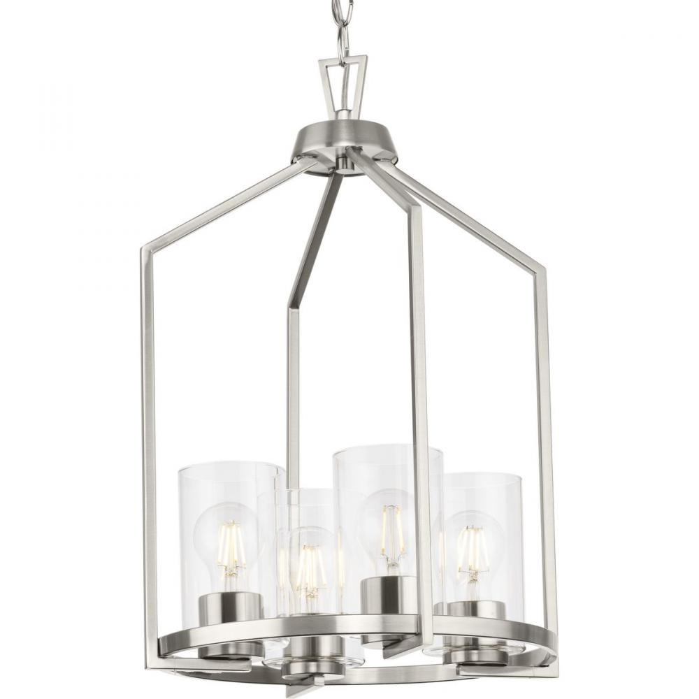 Clear glass shades deliver a modern flair to the fixture's contemporary form