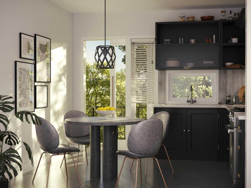 The pendant features painted black steel blending together in an esoteric conjunction, creating a prominent geometrical surround